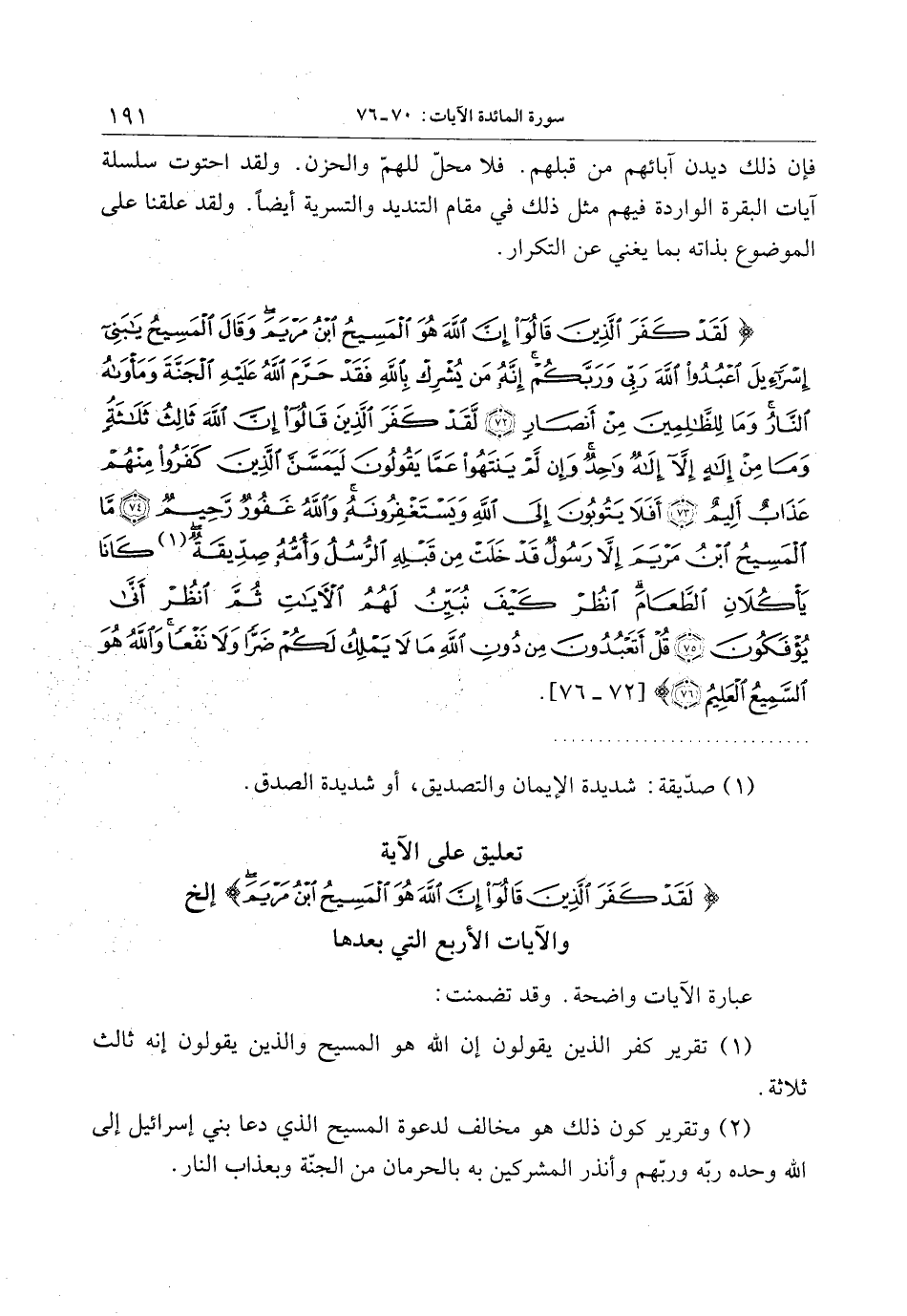 تعليق على الآية لَقَدْ كَفَرَ الَّذِينَ قالُوا إِنَّ اللَّهَ هُوَ الْمَسِيحُ ابْنُ مَرْيَمَ إلخ والآيات الأربع التي بعدها