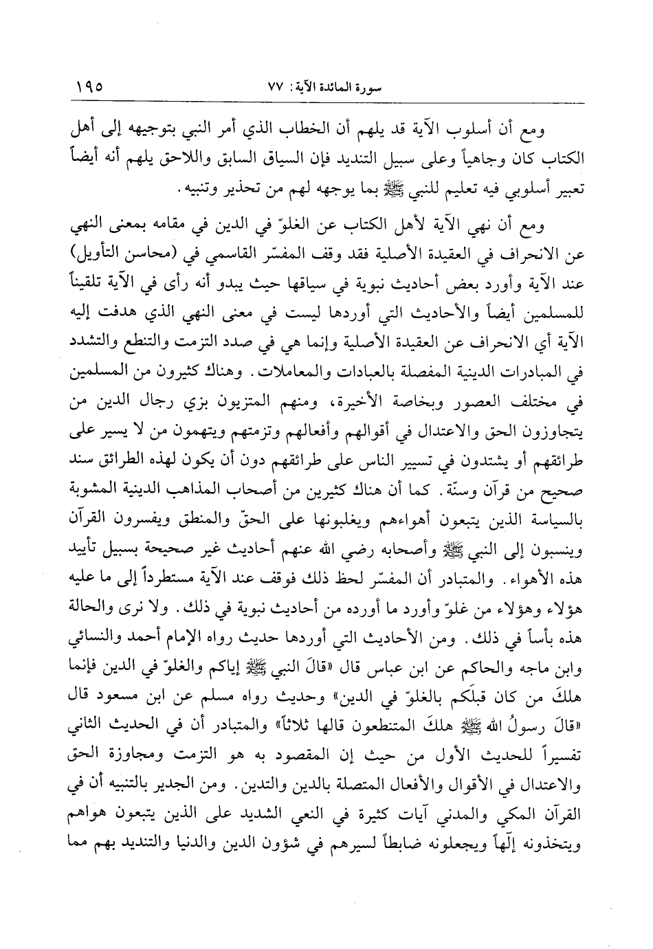ومع أن نهي الآية لأهل الكتاب عن الغلوّ في الدين في مقامه بمعنى النهي عن الانحراف في العقيدة الأصلية فقد وقف المفسّر القاسمي في (محاسن التأويل) عند الآية وأورد بعض أحاديث نبوية في سياقها حيث يبدو أنه رأى في الآية تلقينا للمسلمين أيضا والأحاديث التي أوردها ليست في معنى النهي الذي هدفت إليه الآية أي الانحراف عن العقيدة الأصلية وإنما هي في صدد التزمت والتنطع والتشدد في المبادرات الدينية المفصلة بالعبادات والمعاملات. وهناك كثيرون من المسلمين في مختلف العصور وبخاصة الأخيرة، ومنهم المتزيون بزي رجال الدين من يتجاوزون الحق والاعتدال في أقوالهم وأفعالهم وتزمتهم ويتهمون من لا يسير على طرائقهم أو يشتدون في تسيير الناس على طرائقهم دون أن يكون لهذه الطرائق سند صحيح من قرآن وسنّة. كما أن هناك كثيرين من أصحاب المذاهب الدينية المشوبة بالسياسة الذين يتبعون أهواءهم ويغلبونها على الحقّ والمنطق ويفسرون القرآن وينسبون إلى النبي صلى الله عليه وسلم وأصحابه رضي الله عنهم أحاديث غير صحيحة بسبيل تأييد هذه الأهواء. والمتبادر أن المفسّر لحظ ذلك فوقف عند الآية مستطردا إلى ما عليه هؤلاء وهؤلاء من غلوّ وأورد ما أورده من أحاديث نبوية في ذلك. ولا نرى والحالة هذه بأسا في ذلك. ومن الأحاديث التي أوردها حديث رواه الإمام أحمد والنسائي وابن ماجه والحاكم عن ابن عباس قال «قال النبي صلى الله عليه وسلم إياكم والغلوّ في الدين فإنما هلك من كان قبلكم بالغلوّ في الدين» وحديث رواه مسلم عن ابن مسعود قال «قال رسول الله صلى الله عليه وسلم هلك المتنطعون قالها ثلاثا» والمتبادر أن في الحديث الثاني تفسيرا للحديث الأول من حيث إن المقصود به هو التزمت ومجاوزة الحق والاعتدال في الأقوال والأفعال المتصلة بالدين والتدين. ومن الجدير بالتنبيه أن في القرآن المكي والمدني آيات كثيرة في النعي الشديد على الذين يتبعون هواهم ويتخذونه إلها ويجعلونه ضابطا لسيرهم في شؤون الدين والدنيا والتنديد بهم مما