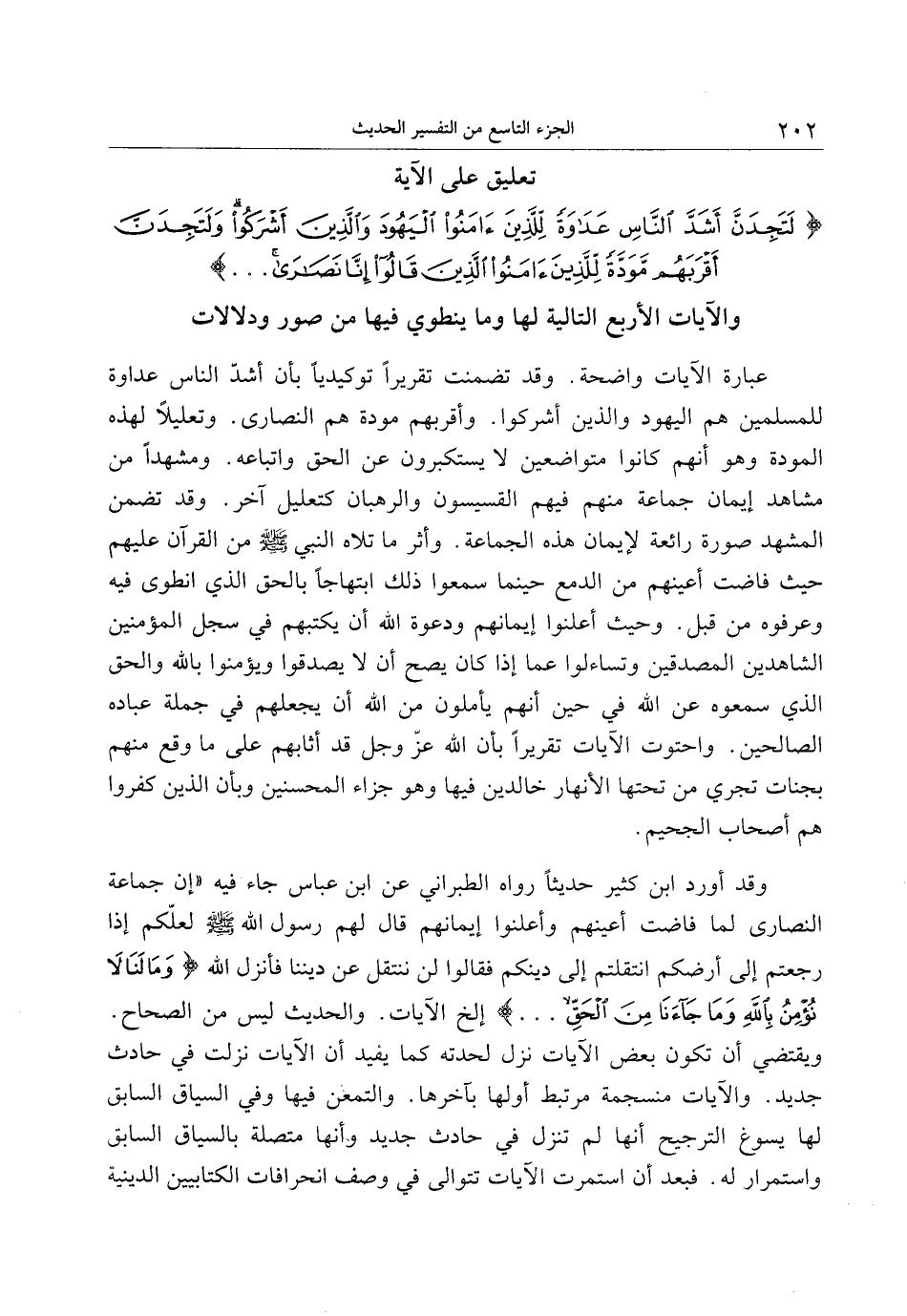 تعليق على الآية لَتَجِدَنَّ أَشَدَّ النَّاسِ عَداوَةً لِلَّذِينَ آمَنُوا الْيَهُودَ وَالَّذِينَ أَشْرَكُوا وَلَتَجِدَنَّ أَقْرَبَهُمْ مَوَدَّةً لِلَّذِينَ آمَنُوا الَّذِينَ قالُوا إِنَّا نَصارى ... والآيات الأربع التالية لها وما ينطوي فيها من صور ودلالات