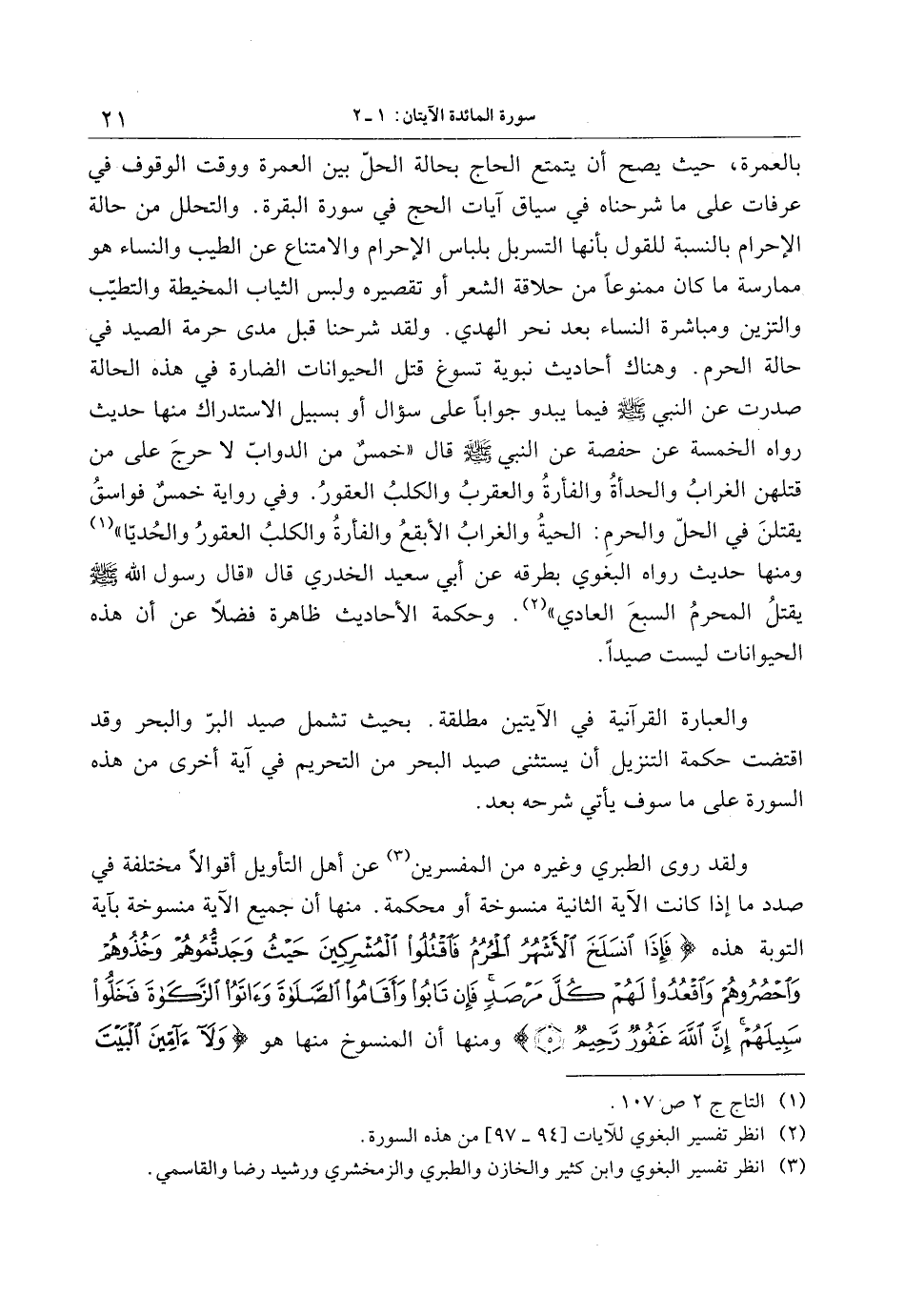 بالعمرة، حيث يصح أن يتمتع الحاج بحالة الحلّ بين العمرة ووقت الوقوف في عرفات على ما شرحناه في سياق آيات الحج في سورة البقرة. والتحلل من حالة الإحرام بالنسبة للقول بأنها التسربل بلباس الإحرام والامتناع عن الطيب والنساء هو ممارسة ما كان ممنوعا من حلاقة الشعر أو تقصيره ولبس الثياب المخيطة والتطيّب والتزين ومباشرة النساء بعد نحر الهدي. ولقد شرحنا قبل مدى حرمة الصيد في حالة الحرم. وهناك أحاديث نبوية تسوغ قتل الحيوانات الضارة في هذه الحالة صدرت عن النبي صلى الله عليه وسلم فيما يبدو جوابا على سؤال أو بسبيل الاستدراك منها حديث رواه الخمسة عن حفصة عن النبي صلى الله عليه وسلم قال «خمس من الدوابّ لا حرج على من قتلهن الغراب والحدأة والفأرة والعقرب والكلب العقور. وفي رواية خمس فواسق يقتلن في الحلّ والحرم: الحية والغراب الأبقع والفأرة والكلب العقور والحدأة» «1» ومنها حديث رواه البغوي بطرقه عن أبي سعيد الخدري قال «قال رسول الله صلى الله عليه وسلم يقتل المحرم السبع العادي» «2» . وحكمة الأحاديث ظاهرة فضلا عن أن هذه الحيوانات ليست صيدا.