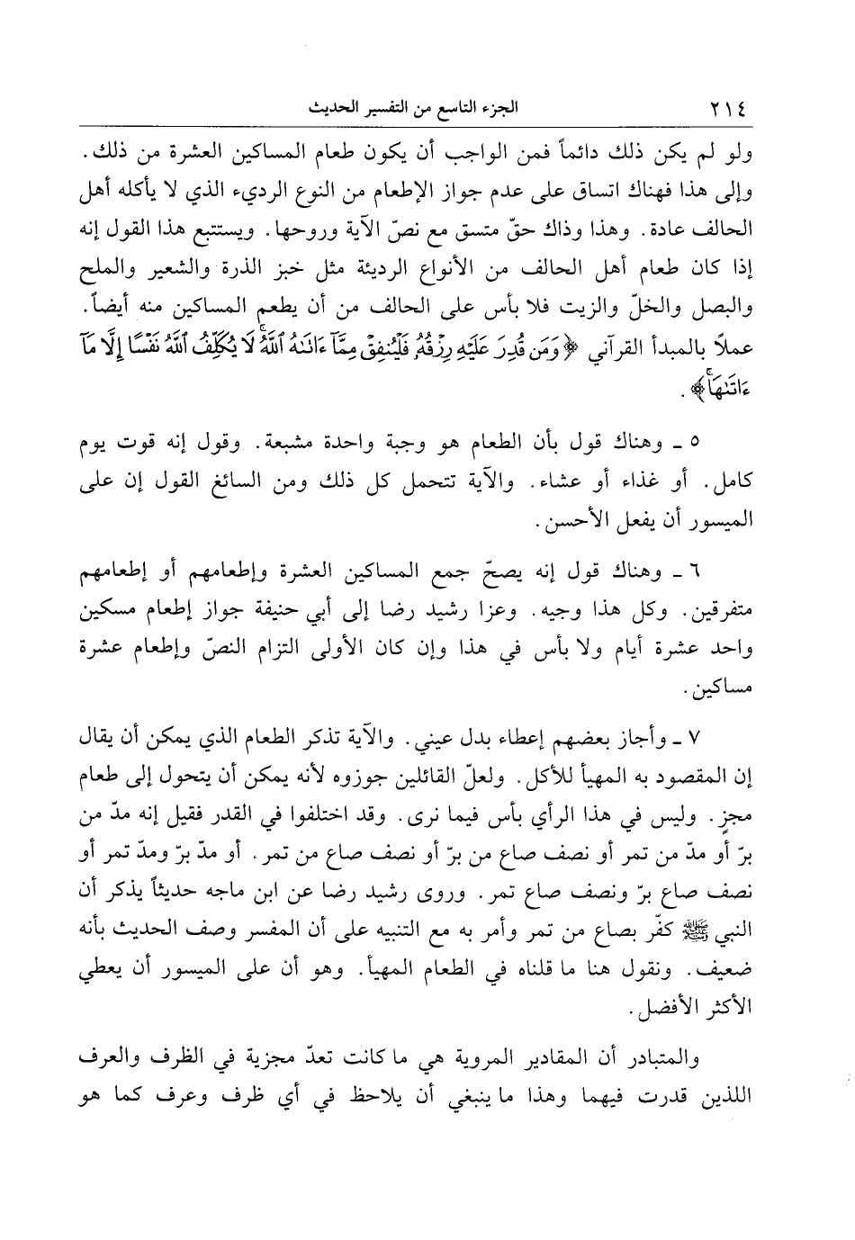 7- وأجاز بعضهم إعطاء بدل عيني. والآية تذكر الطعام الذي يمكن أن يقال إن المقصود به المهيأ للأكل. ولعلّ القائلين جوزوه لأنه يمكن أن يتحول إلى طعام مجز. وليس في هذا الرأي بأس فيما نرى. وقد اختلفوا في القدر فقيل إنه مدّ من برّ أو مدّ من تمر أو نصف صاع من برّ أو نصف صاع من تمر. أو مدّ برّ ومدّ تمر أو نصف صاع برّ ونصف صاع تمر. وروى رشيد رضا عن ابن ماجه حديثا يذكر أن النبي صلى الله عليه وسلم كفّر بصاع من تمر وأمر به مع التنبيه على أن المفسر وصف الحديث بأنه ضعيف. ونقول هنا ما قلناه في الطعام المهيأ. وهو أن على الميسور أن يعطي الأكثر الأفضل.
