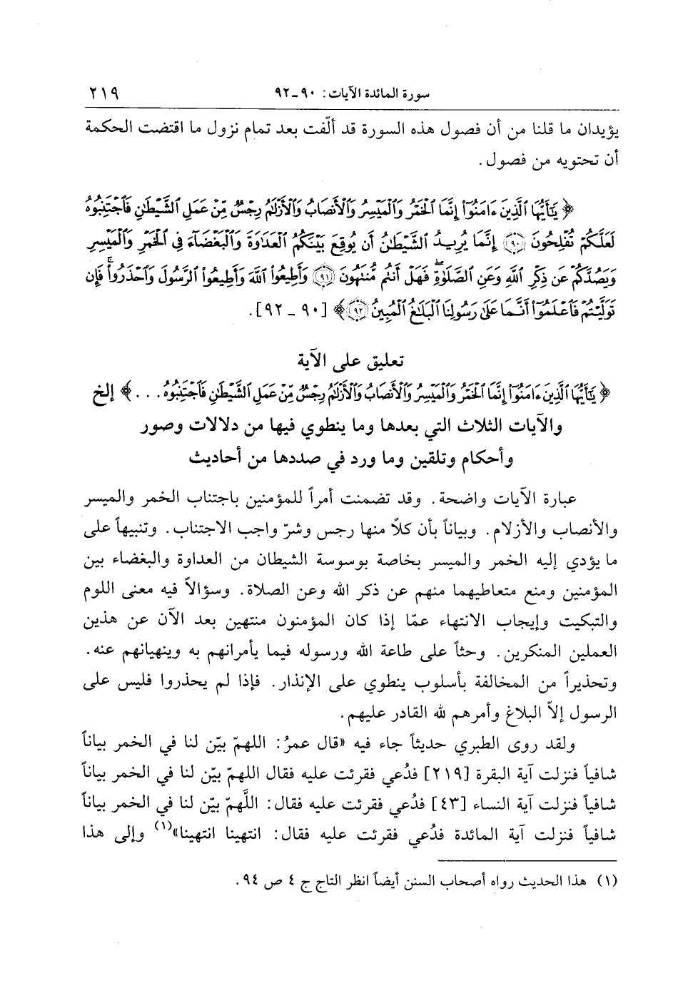 . تعليق على الآية يا أَيُّهَا الَّذِينَ آمَنُوا إِنَّمَا الْخَمْرُ وَالْمَيْسِرُ وَالْأَنْصابُ وَالْأَزْلامُ رِجْسٌ مِنْ عَمَلِ الشَّيْطانِ فَاجْتَنِبُوهُ ... إلخ والآيات الثلاث التي بعدها وما ينطوي فيها من دلالات وصور وأحكام وتلقين وما ورد في صددها من أحاديث
