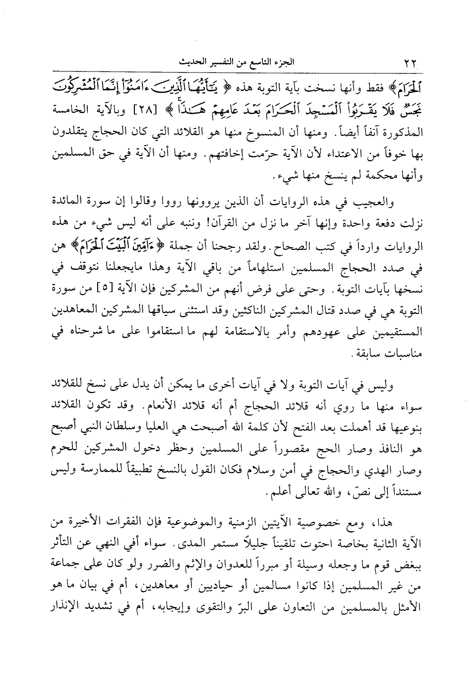 وليس في آيات التوبة ولا في آيات أخرى ما يمكن أن يدل على نسخ للقلائد سواء منها ما روي أنه قلائد الحجاج أم أنه قلائد الأنعام. وقد تكون القلائد بنوعيها قد أهملت بعد الفتح لأن كلمة الله أصبحت هي العليا وسلطان النبي أصبح هو النافذ وصار الحج مقصورا على المسلمين وحظر دخول المشركين للحرم وصار الهدي والحجاج في أمن وسلام فكان القول بالنسخ تطبيقا للممارسة وليس مستندا إلى نصّ، والله تعالى أعلم.