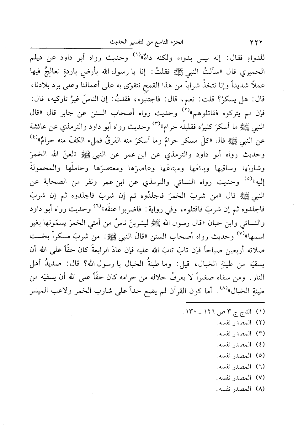 للدواء فقال: إنه ليس بدواء ولكنه داء» «1» وحديث رواه أبو داود عن ديلم الحميري قال «سألت النبي صلى الله عليه وسلم فقلت: إنا يا رسول الله بأرض باردة نعالج فيها عملا شديدا وإنا نتخذ شرابا من هذا القمح نتقوّى به على أعمالنا وعلى برد بلادنا، قال: هل يسكر؟ قلت: نعم، قال: فاجتنبوه، فقلت: إن الناس غير تاركيه، قال: