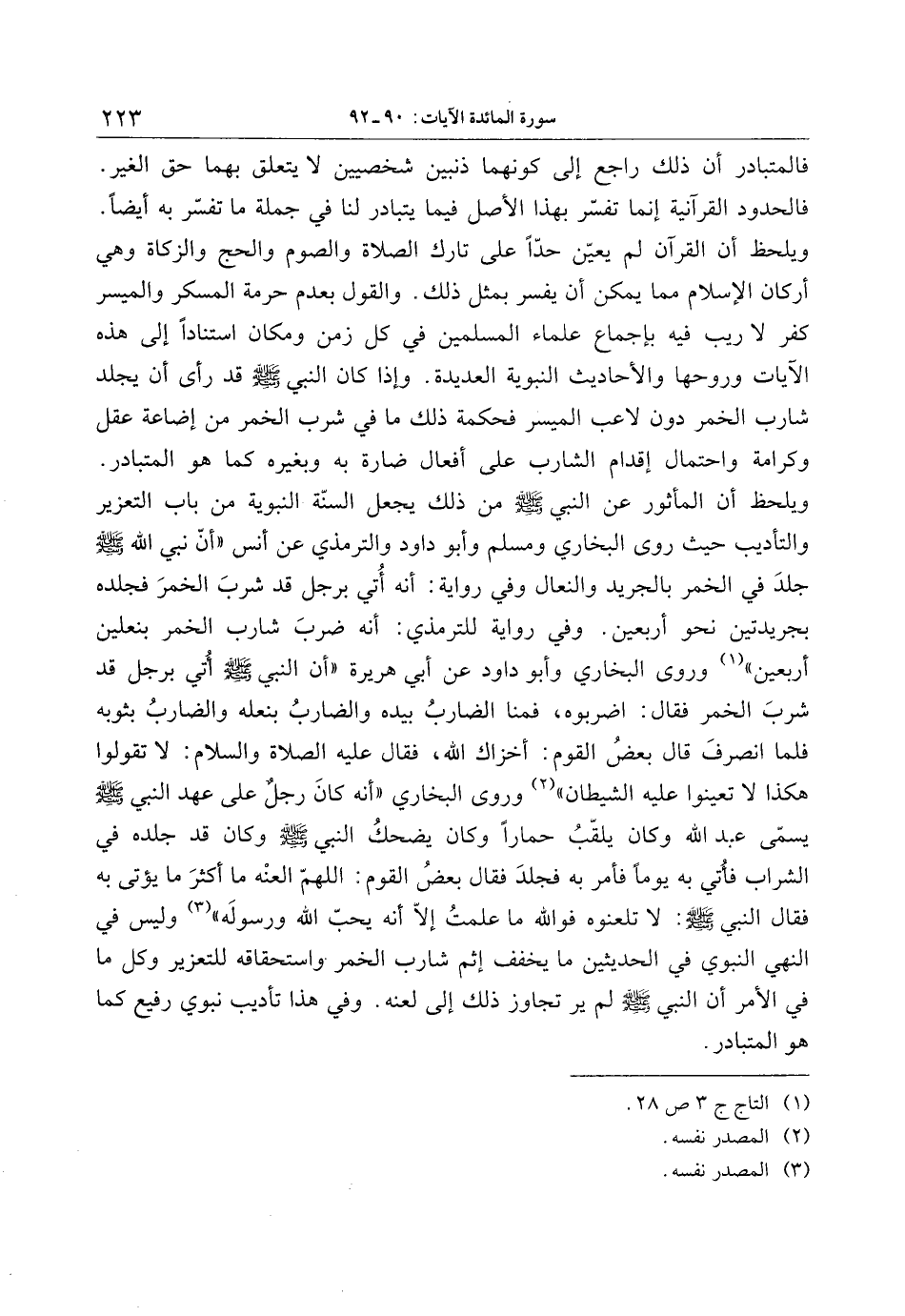 ويلحظ أن القرآن لم يعيّن حدّا على تارك الصلاة والصوم والحج والزكاة وهي أركان الإسلام مما يمكن أن يفسر بمثل ذلك. والقول بعدم حرمة المسكر والميسر كفر لا ريب فيه بإجماع علماء المسلمين في كل زمن ومكان استنادا إلى هذه الآيات وروحها والأحاديث النبوية العديدة. وإذا كان النبي صلى الله عليه وسلم قد رأى أن يجلد شارب الخمر دون لاعب الميسر فحكمة ذلك ما في شرب الخمر من إضاعة عقل وكرامة واحتمال إقدام الشارب على أفعال ضارة به وبغيره كما هو المتبادر.