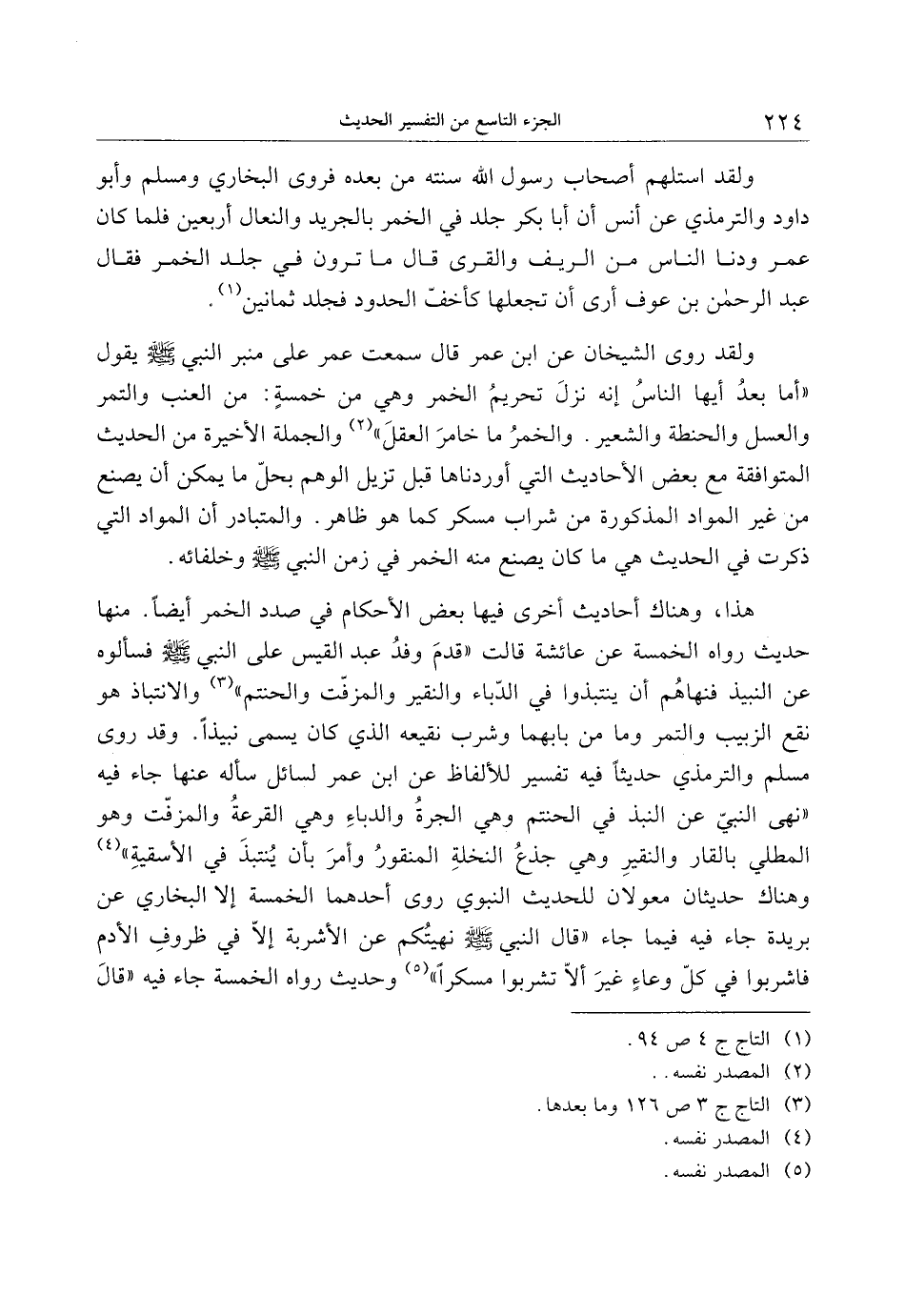 ولقد روى الشيخان عن ابن عمر قال سمعت عمر على منبر النبي صلى الله عليه وسلم يقول «أما بعد أيها الناس إنه نزل تحريم الخمر وهي من خمسة: من العنب والتمر والعسل والحنطة والشعير. والخمر ما خامر العقل» «2» والجملة الأخيرة من الحديث المتوافقة مع بعض الأحاديث التي أوردناها قبل تزيل الوهم بحلّ ما يمكن أن يصنع من غير المواد المذكورة من شراب مسكر كما هو ظاهر. والمتبادر أن المواد التي ذكرت في الحديث هي ما كان يصنع منه الخمر في زمن النبي صلى الله عليه وسلم وخلفائه.