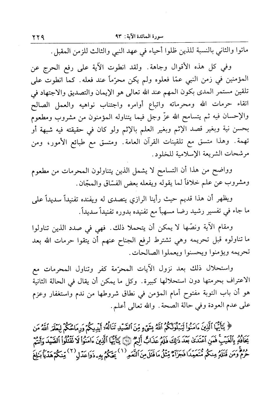 ومقام الآية ونصّها لا يمكن أن يتحملا ذلك. فهي في صدد الذين تناولوا ما تناولوه قبل تحريمه وهي تشترط لرفع الجناح عنهم أن يتقوا حرمات الله بعد تحريمه ويؤمنوا ويحسنوا ويعملوا الصالحات.
