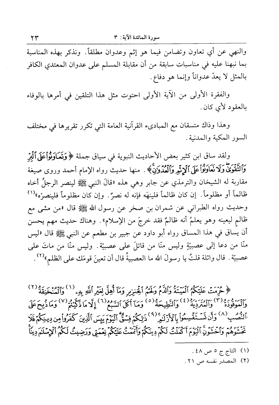 ولقد ساق ابن كثير بعض الأحاديث النبوية في سياق جملة وَتَعاوَنُوا عَلَى الْبِرِّ وَالتَّقْوى وَلا تَعاوَنُوا عَلَى الْإِثْمِ وَالْعُدْوانِ. منها حديث رواه الإمام أحمد وروى صيغة مقاربة له الشيخان والترمذي عن جابر وهي هذه «قال النبي صلى الله عليه وسلم لينصر الرجل أخاه ظالما أو مظلوما. إن كان ظالما فلينهه فإنه له نصر. وإن كان مظلوما فلينصره» «1» وحديث رواه الطبراني عن شمران بن صخر عن رسول الله صلى الله عليه وسلم قال «من مشى مع ظالم ليعينه وهو يعلم أنه ظالم فقد خرج من الإسلام» . وهناك حديث مهم يحسن أن يساق في هذا المساق رواه أبو داود عن جبير بن مطعم عن النبي صلى الله عليه وسلم قال «ليس منّا من دعا إلى عصبيّة وليس منّا من قاتل على عصبيّة. وليس منّا من مات على عصبيّة. قال واثلة قلت يا رسول الله ما العصبية قال أن تعين قومك على الظلم» «2» .