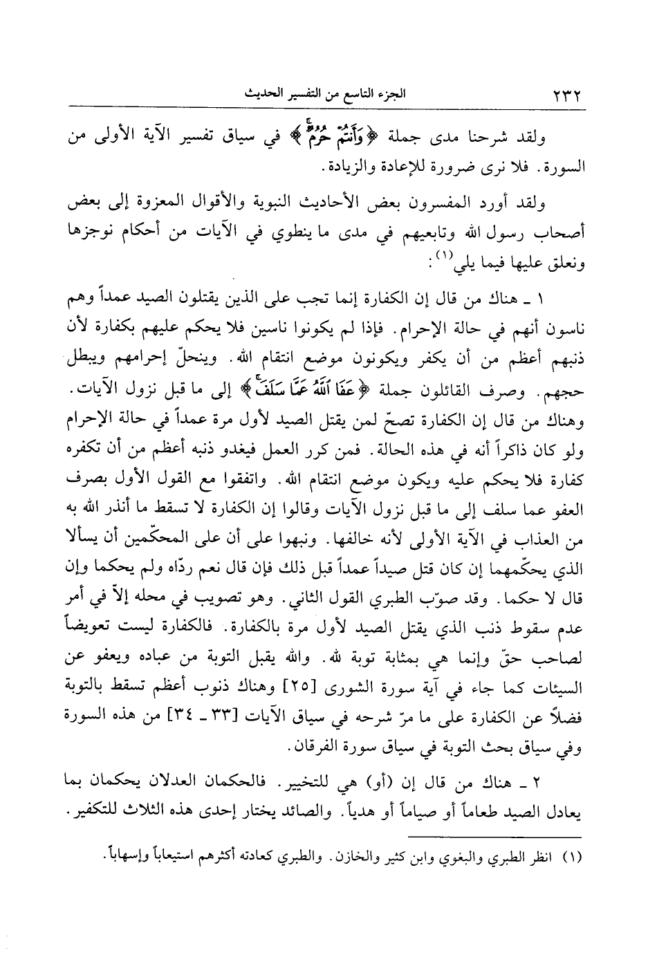 1- هناك من قال إن الكفارة إنما تجب على الذين يقتلون الصيد عمدا وهم ناسون أنهم في حالة الإحرام. فإذا لم يكونوا ناسين فلا يحكم عليهم بكفارة لأن ذنبهم أعظم من أن يكفر ويكونون موضع انتقام الله. وينحلّ إحرامهم ويبطل حجهم. وصرف القائلون جملة عَفَا اللَّهُ عَمَّا سَلَفَ إلى ما قبل نزول الآيات.