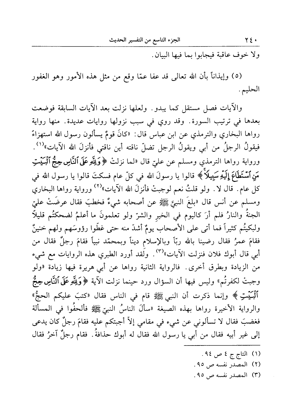 ورواية رواها الترمذي ومسلم عن عليّ قال «لما نزلت وَلِلَّهِ عَلَى النَّاسِ حِجُّ الْبَيْتِ مَنِ اسْتَطاعَ إِلَيْهِ سَبِيلًا قالوا يا رسول الله في كلّ عام فسكت قالوا يا رسول الله في كل عام. قال لا. ولو قلت نعم لوجبت فأنزل الله الآيات» «2» ورواية رواها البخاري ومسلم عن أنس قال «بلغ النبيّ صلى الله عليه وسلم عن أصحابه شيء فخطب فقال عرضت عليّ الجنة والنار فلم أر كاليوم في الخير والشرّ ولو تعلمون ما أعلم لضحكتم قليلا ولبكيتم كثيرا فما أتى على الأصحاب يوم أشدّ منه حتى غطّوا رؤوسهم ولهم خنين فقام عمر فقال رضينا بالله ربّا وبالإسلام دينا وبمحمّد نبيا فقام رجل فقال من أبي قال أبوك فلان فنزلت الآيات» «3» . ولقد أورد الطبري هذه الروايات مع شيء من الزيادة وبطرق أخرى. فالرواية الثانية رواها عن أبي هريرة فيها زيادة «ولو وجبت لكفرتم» وليس فيها أن السؤال ورد حينما نزلت الآية وَلِلَّهِ عَلَى النَّاسِ حِجُّ الْبَيْتِ وإنما ذكرت أن النبي صلى الله عليه وسلم قام في الناس فقال «كتب عليكم الحجّ» والرواية الأخيرة رواها بهذه الصيغة «سأل الناس النبيّ صلى الله عليه وسلم فألحفوا في المسألة فغضب فقال لا تسألوني عن شيء في مقامي إلّا أجبتكم عليه فقام رجل كان يدعى إلى غير أبيه فقال من أبي يا رسول الله فقال له أبوك حذافة. فقام رجل آخر فقال