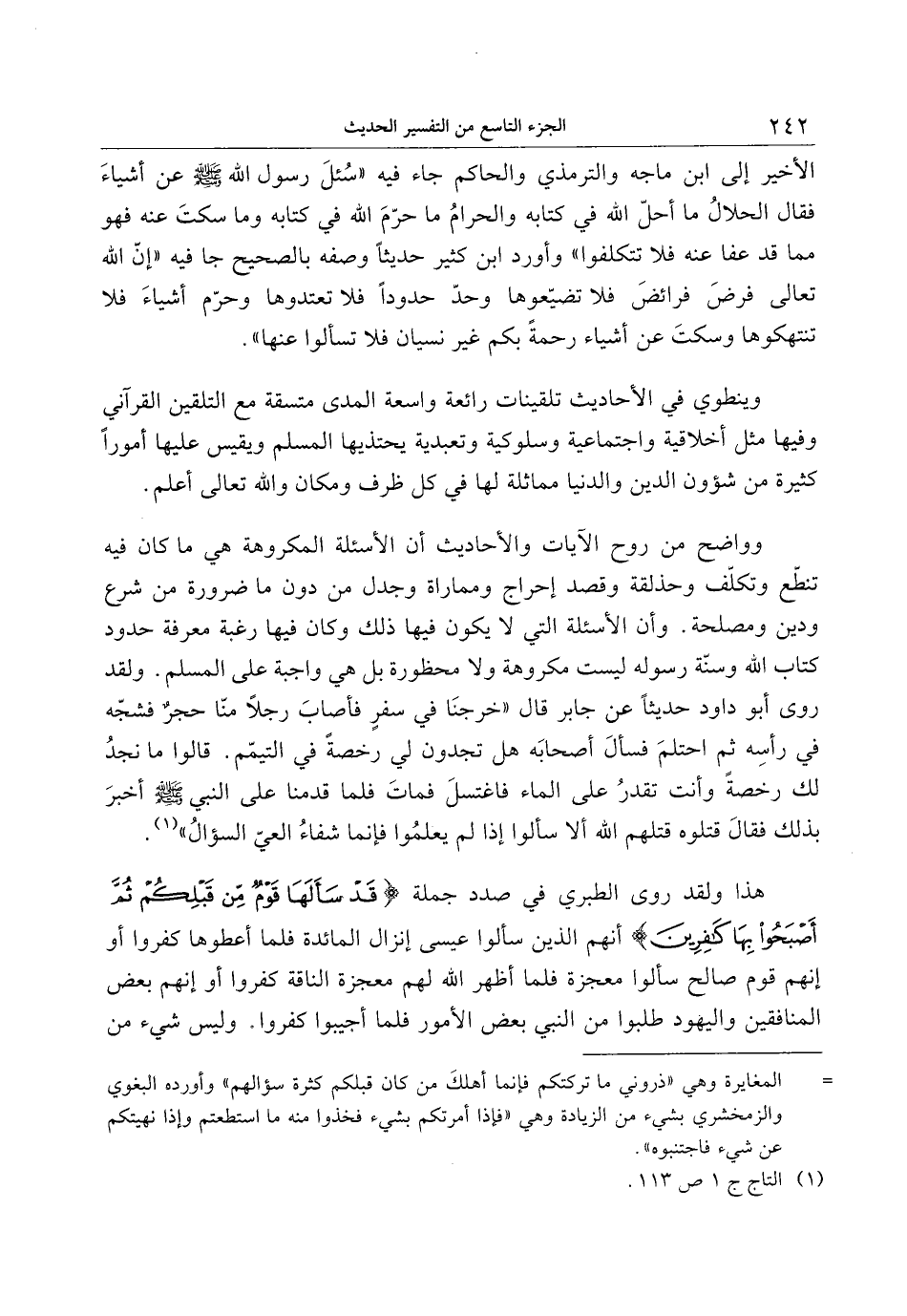 وواضح من روح الآيات والأحاديث أن الأسئلة المكروهة هي ما كان فيه تنطّع وتكلّف وحذلقة وقصد إحراج ومماراة وجدل من دون ما ضرورة من شرع ودين ومصلحة. وأن الأسئلة التي لا يكون فيها ذلك وكان فيها رغبة معرفة حدود كتاب الله وسنّة رسوله ليست مكروهة ولا محظورة بل هي واجبة على المسلم. ولقد روى أبو داود حديثا عن جابر قال «خرجنا في سفر فأصاب رجلا منّا حجر فشجّه في رأسه ثم احتلم فسأل أصحابه هل تجدون لي رخصة في التيمّم. قالوا ما نجد لك رخصة وأنت تقدر على الماء فاغتسل فمات فلما قدمنا على النبي صلى الله عليه وسلم أخبر بذلك فقال قتلوه قتلهم الله ألا سألوا إذا لم يعلموا فإنما شفاء العيّ السؤال» «1» .