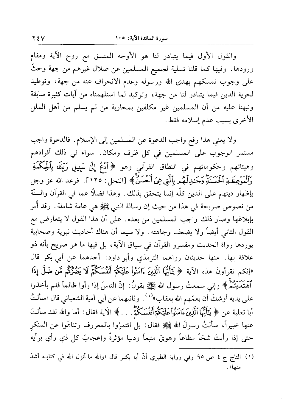 ولا يعني هذا رفع واجب الدعوة عن المسلمين إلى الإسلام. فالدعوة واجب مستمر الوجوب على المسلمين في كل ظرف ومكان. سواء في ذلك أفرادهم وهيئاتهم وحكوماتهم في النطاق القرآني وهو ادْعُ إِلى سَبِيلِ رَبِّكَ بِالْحِكْمَةِ وَالْمَوْعِظَةِ الْحَسَنَةِ وَجادِلْهُمْ بِالَّتِي هِيَ أَحْسَنُ [النحل: 125] . فوعد الله عز وجل بإظهار دينهم على الدين كلّه إنما يتحقق بذلك. وهذا فضلا عما في القرآن والسنّة من نصوص صريحة في هذا من حيث إن رسالة النبي صلى الله عليه وسلم هي عامة شاملة. وقد أمر بإبلاغها وصار ذلك واجب المسلمين من بعده. على أن هذا القول لا يتعارض مع القول الثاني أيضا ولا يضعف وجاهته. ولا سيما أن هناك أحاديث نبوية وصحابية يوردها رواة الحديث ومفسرو القرآن في سياق الآية، بل فيها ما هو صريح بأنه ذو علاقة بها. منها حديثان رواهما الترمذي وأبو داود: أحدهما عن أبي بكر قال «إنكم تقرءون هذه الآية يا أَيُّهَا الَّذِينَ آمَنُوا عَلَيْكُمْ أَنْفُسَكُمْ لا يَضُرُّكُمْ مَنْ ضَلَّ إِذَا اهْتَدَيْتُمْ وإني سمعت رسول الله صلى الله عليه وسلم يقول: إنّ الناس إذا رأوا ظالما فلم يأخذوا على يديه أو شك أن يعمّهم الله بعقاب» «1» . وثانيهما عن أبي أمية الشعباني قال «سألت أبا ثعلبة عن يا أَيُّهَا الَّذِينَ آمَنُوا عَلَيْكُمْ أَنْفُسَكُمْ ... الآية فقال: أما والله لقد سألت عنها خبيرا، سألت رسول الله صلى الله عليه وسلم فقال: بل ائتمروا بالمعروف وتناهوا عن المنكر حتى إذا رأيت شحّا مطاعا وهوى متبعا ودنيا مؤثرة وإعجاب كل ذي رأي برأيه