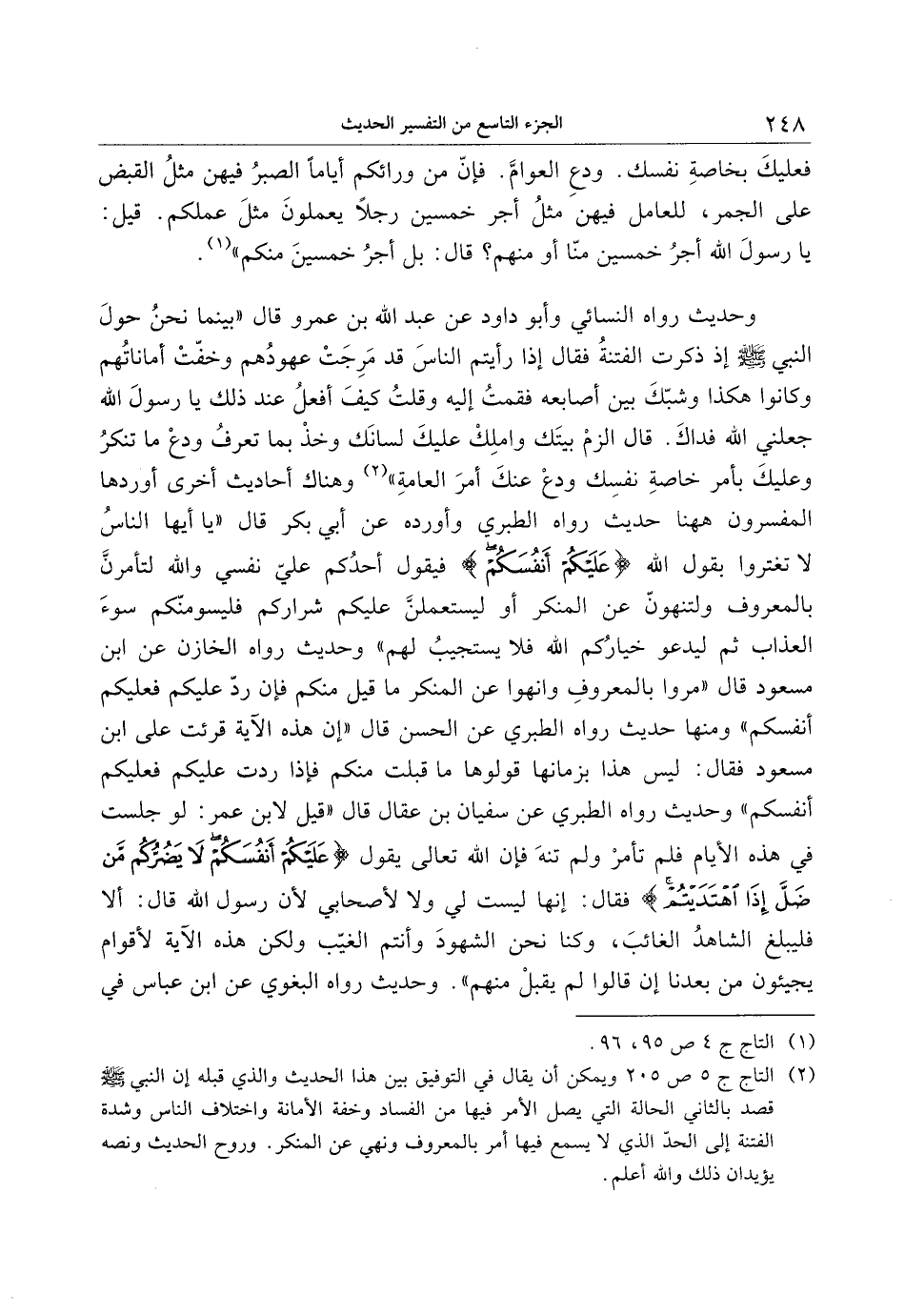 وحديث رواه النسائي وأبو داود عن عبد الله بن عمرو قال «بينما نحن حول النبي صلى الله عليه وسلم إذ ذكرت الفتنة فقال إذا رأيتم الناس قد مرجت عهودهم وخفّت أماناتهم وكانوا هكذا وشبّك بين أصابعه فقمت إليه وقلت كيف أفعل عند ذلك يا رسول الله جعلني الله فداك. قال الزم بيتك واملك عليك لسانك وخذ بما تعرف ودع ما تنكر وعليك بأمر خاصة نفسك ودع عنك أمر العامة» «2» وهناك أحاديث أخرى أوردها المفسرون هاهنا حديث رواه الطبري وأورده عن أبي بكر قال «يا أيها الناس لا تغتروا بقول الله عَلَيْكُمْ أَنْفُسَكُمْ فيقول أحدكم عليّ نفسي والله لتأمرنّ بالمعروف ولتنهونّ عن المنكر أو ليستعملنّ عليكم شراركم فليسومنّكم سوء العذاب ثم ليدعو خياركم الله فلا يستجيب لهم» وحديث رواه الخازن عن ابن مسعود قال «مروا بالمعروف وانهوا عن المنكر ما قيل منكم فإن ردّ عليكم فعليكم أنفسكم» ومنها حديث رواه الطبري عن الحسن قال «إن هذه الآية قرئت على ابن مسعود فقال: ليس هذا بزمانها قولوها ما قبلت منكم فإذا ردت عليكم فعليكم أنفسكم» وحديث رواه الطبري عن سفيان بن عقال قال «قيل لابن عمر: لو جلست في هذه الأيام فلم تأمر ولم تنه فإن الله تعالى يقول عَلَيْكُمْ أَنْفُسَكُمْ لا يَضُرُّكُمْ مَنْ ضَلَّ إِذَا اهْتَدَيْتُمْ فقال: إنها ليست لي ولا لأصحابي لأن رسول الله قال: ألا فليبلغ الشاهد الغائب، وكنا نحن الشهود وأنتم الغيّب ولكن هذه الآية لأقوام يجيئون من بعدنا إن قالوا لم يقبل منهم» . وحديث رواه البغوي عن ابن عباس في