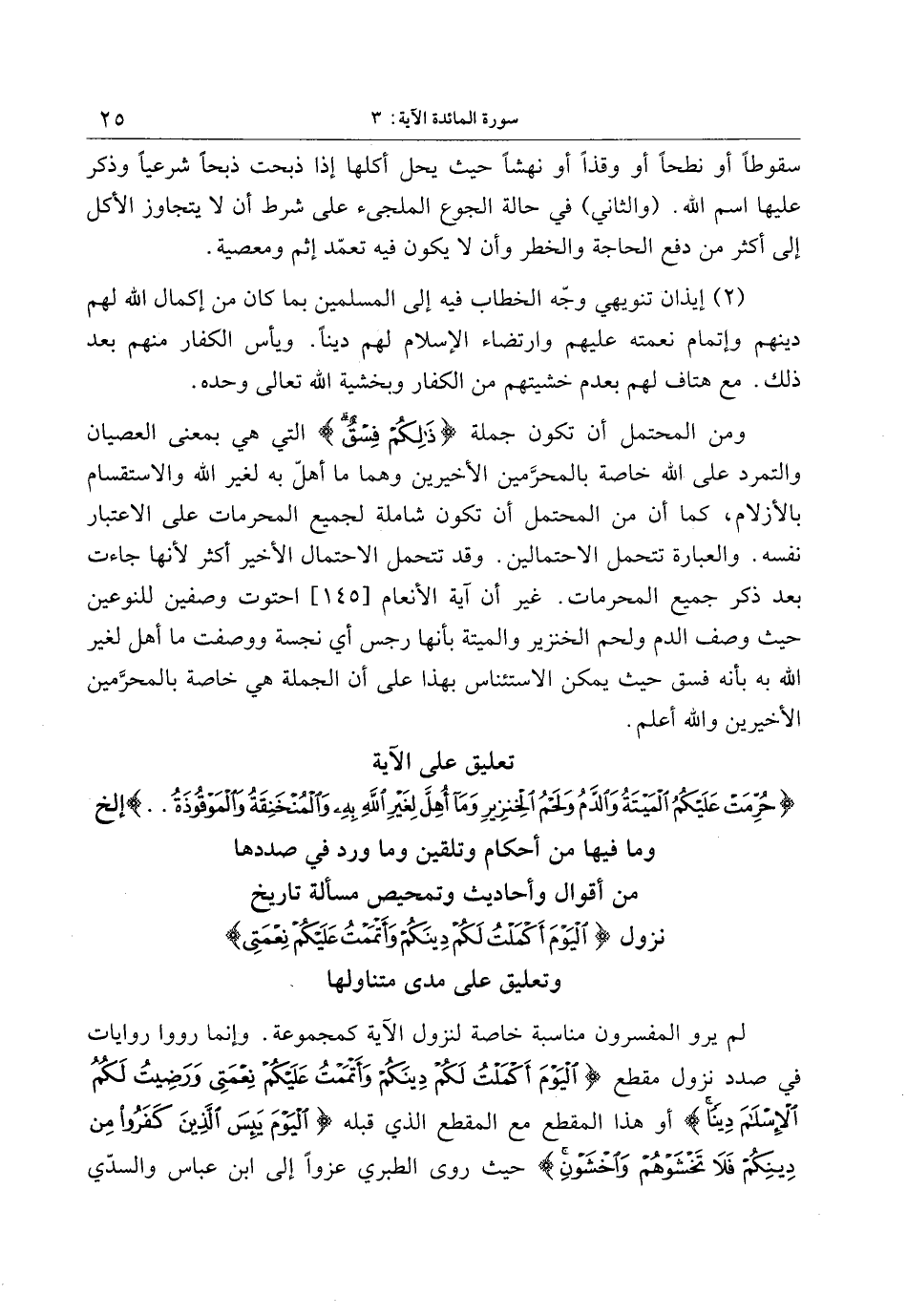 تعليق على الآية حُرِّمَتْ عَلَيْكُمُ الْمَيْتَةُ وَالدَّمُ وَلَحْمُ الْخِنْزِيرِ وَما أُهِلَّ لِغَيْرِ اللَّهِ بِهِ وَالْمُنْخَنِقَةُ وَالْمَوْقُوذَةُ.. إلخ وما فيها من أحكام وتلقين وما ورد في صددها من أقوال وأحاديث وتمحيص مسألة تاريخ نزول الْيَوْمَ أَكْمَلْتُ لَكُمْ دِينَكُمْ وَأَتْمَمْتُ عَلَيْكُمْ نِعْمَتِي وتعليق على مدى متناولها