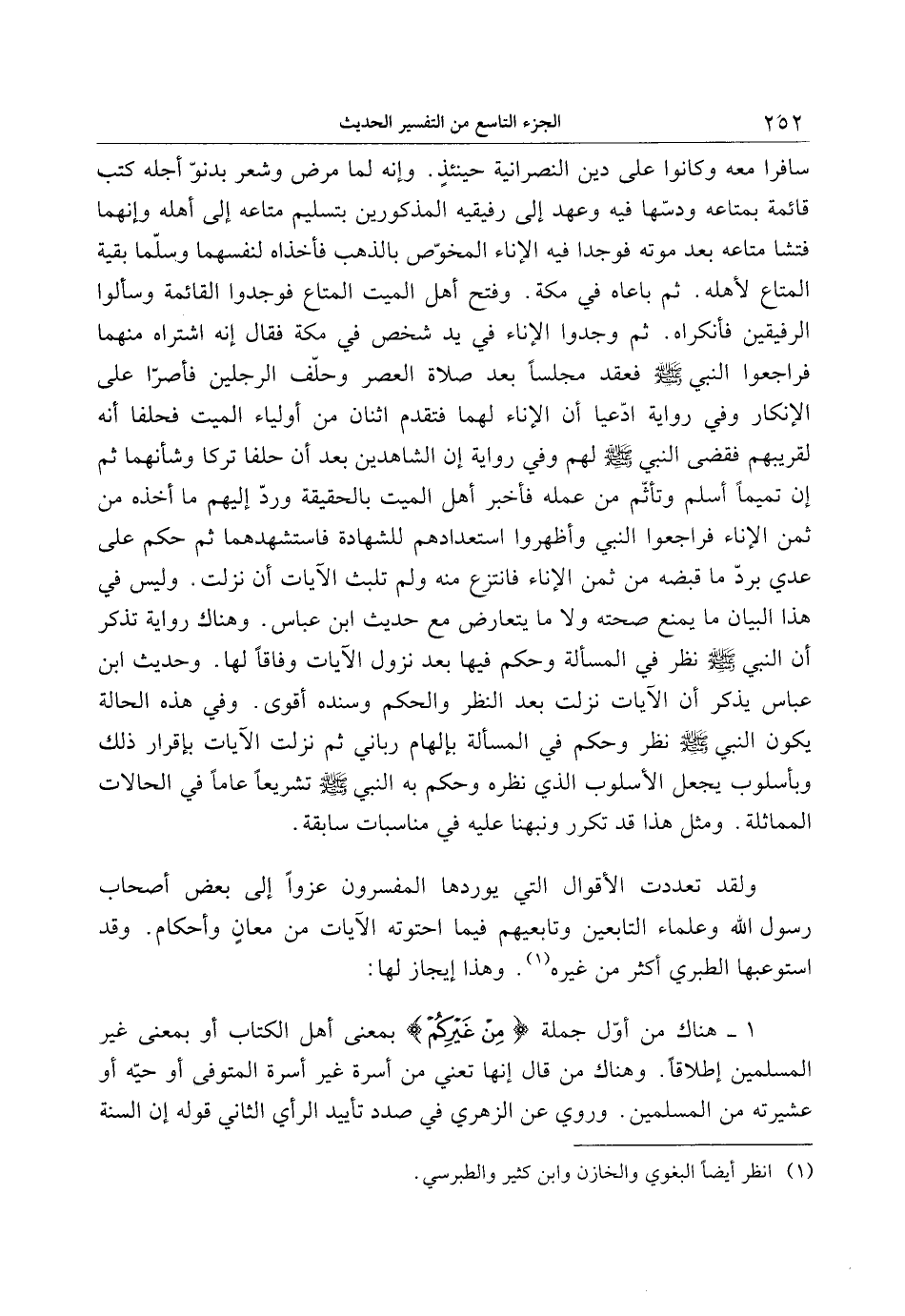 سافرا معه وكانوا على دين النصرانية حينئذ. وإنه لما مرض وشعر بدنوّ أجله كتب قائمة بمتاعه ودسّها فيه وعهد إلى رفيقيه المذكورين بتسليم متاعه إلى أهله وإنهما فتشا متاعه بعد موته فوجدا فيه الإناء المخوّص بالذهب فأخذاه لنفسهما وسلّما بقية المتاع لأهله. ثم باعاه في مكة. وفتح أهل الميت المتاع فوجدوا القائمة وسألوا الرفيقين فأنكراه. ثم وجدوا الإناء في يد شخص في مكة فقال إنه اشتراه منهما فراجعوا النبي صلى الله عليه وسلم فعقد مجلسا بعد صلاة العصر وحلّف الرجلين فأصرّا على الإنكار وفي رواية ادّعيا أن الإناء لهما فتقدم اثنان من أولياء الميت فحلفا أنه لقريبهم فقضى النبي صلى الله عليه وسلم لهم وفي رواية إن الشاهدين بعد أن حلفا تركا وشأنهما ثم إن تميما أسلم وتأثّم من عمله فأخبر أهل الميت بالحقيقة وردّ إليهم ما أخذه من ثمن الإناء فراجعوا النبي وأظهروا استعدادهم للشهادة فاستشهدهما ثم حكم على عدي بردّ ما قبضه من ثمن الإناء فانتزع منه ولم تلبث الآيات أن نزلت. وليس في هذا البيان ما يمنع صحته ولا ما يتعارض مع حديث ابن عباس. وهناك رواية تذكر أن النبي صلى الله عليه وسلم نظر في المسألة وحكم فيها بعد نزول الآيات وفاقا لها. وحديث ابن عباس يذكر أن الآيات نزلت بعد النظر والحكم وسنده أقوى. وفي هذه الحالة يكون النبي صلى الله عليه وسلم نظر وحكم في المسألة بإلهام رباني ثم نزلت الآيات بإقرار ذلك وبأسلوب يجعل الأسلوب الذي نظره وحكم به النبي صلى الله عليه وسلم تشريعا عاما في الحالات المماثلة. ومثل هذا قد تكرر ونبهنا عليه في مناسبات سابقة.
