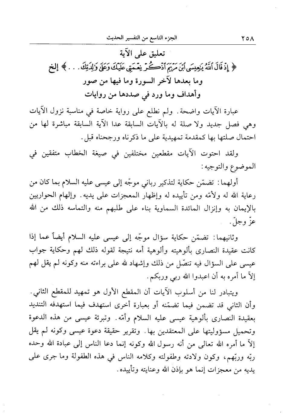 أولهما: تضمّن حكاية لتذكير رباني موجّه إلى عيسى عليه السلام بما كان من رعاية الله له ولأمّه ومن تأييده له وإظهار المعجزات على يديه. وإلهام الحواريين بالإيمان به وإنزال المائدة السماوية بناء على طلبهم منه والتماسه ذلك من الله عزّ وجلّ.