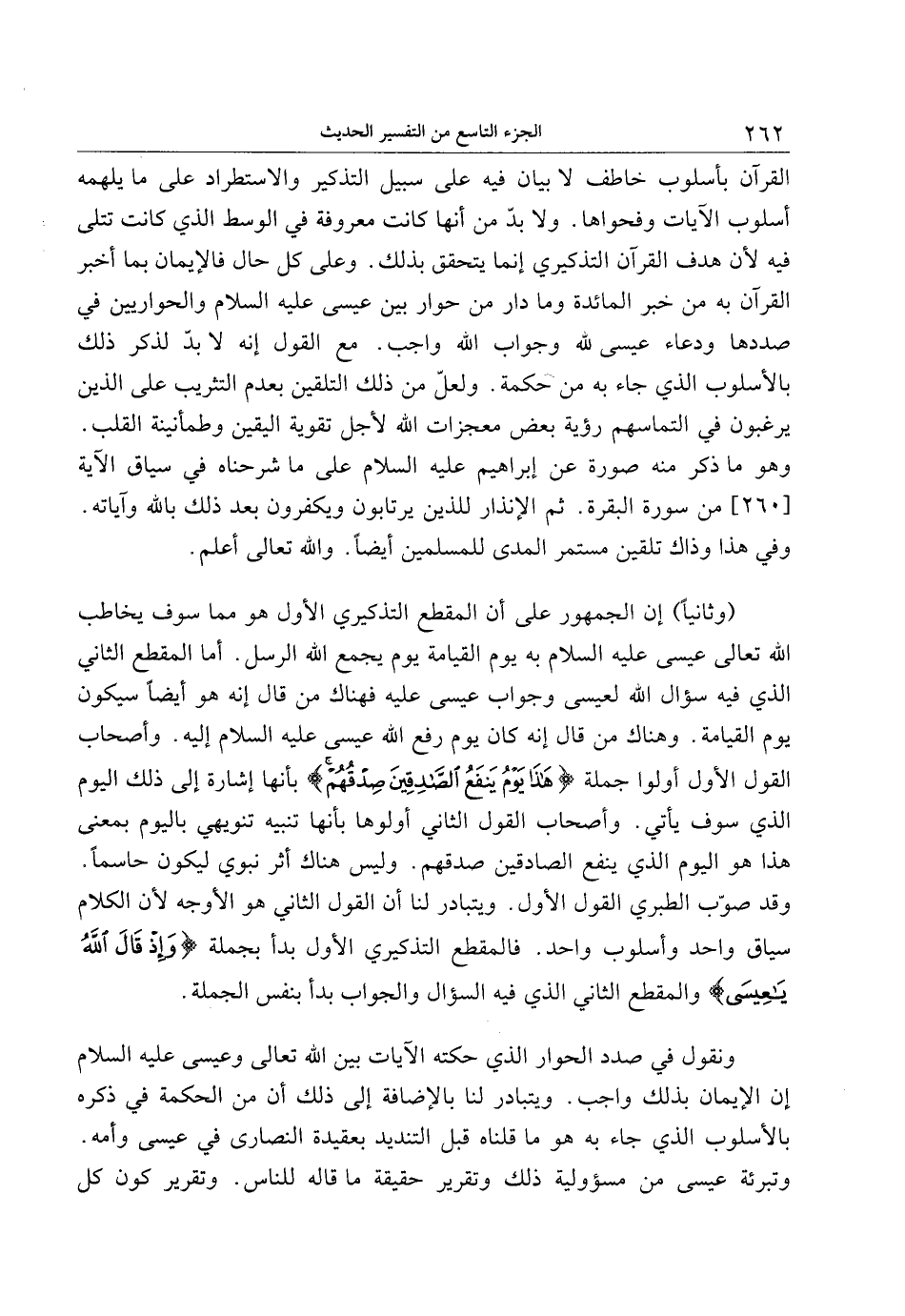 ونقول في صدد الحوار الذي حكته الآيات بين الله تعالى وعيسى عليه السلام إن الإيمان بذلك واجب. ويتبادر لنا بالإضافة إلى ذلك أن من الحكمة في ذكره بالأسلوب الذي جاء به هو ما قلناه قبل التنديد بعقيدة النصارى في عيسى وأمه.