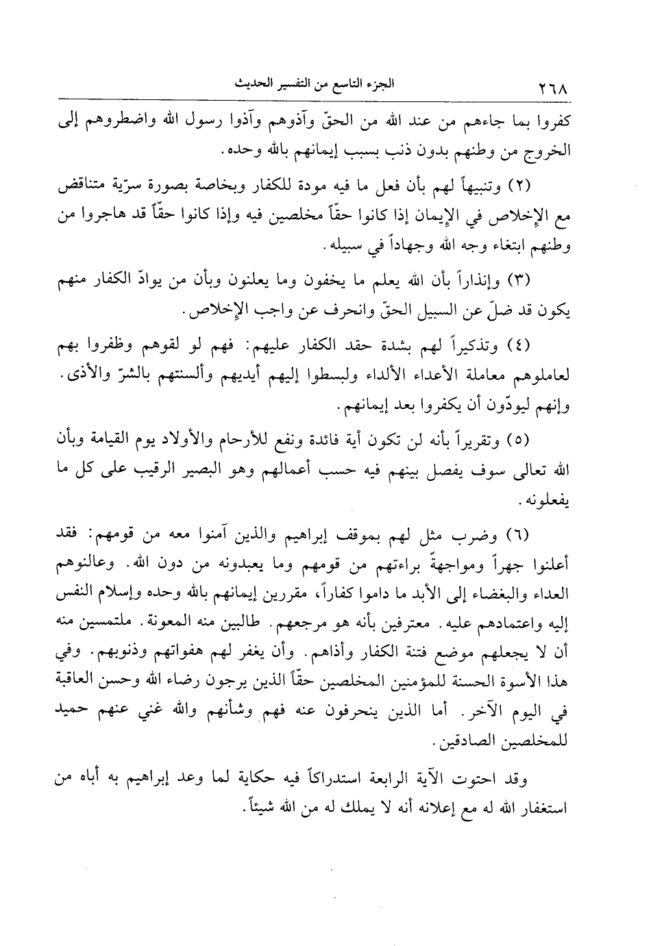 (6) وضرب مثل لهم بموقف إبراهيم والذين آمنوا معه من قومهم: فقد أعلنوا جهرا ومواجهة براءتهم من قومهم وما يعبدونه من دون الله. وعالنوهم العداء والبغضاء إلى الأبد ما داموا كفارا، مقررين إيمانهم بالله وحده وإسلام النفس إليه واعتمادهم عليه. معترفين بأنه هو مرجعهم. طالبين منه المعونة. ملتمسين منه أن لا يجعلهم موضع فتنة الكفار وأذاهم. وأن يغفر لهم هفواتهم وذنوبهم. وفي هذا الأسوة الحسنة للمؤمنين المخلصين حقّا الذين يرجون رضاء الله وحسن العاقبة في اليوم الآخر. أما الذين ينحرفون عنه فهم وشأنهم والله غني عنهم حميد للمخلصين الصادقين.