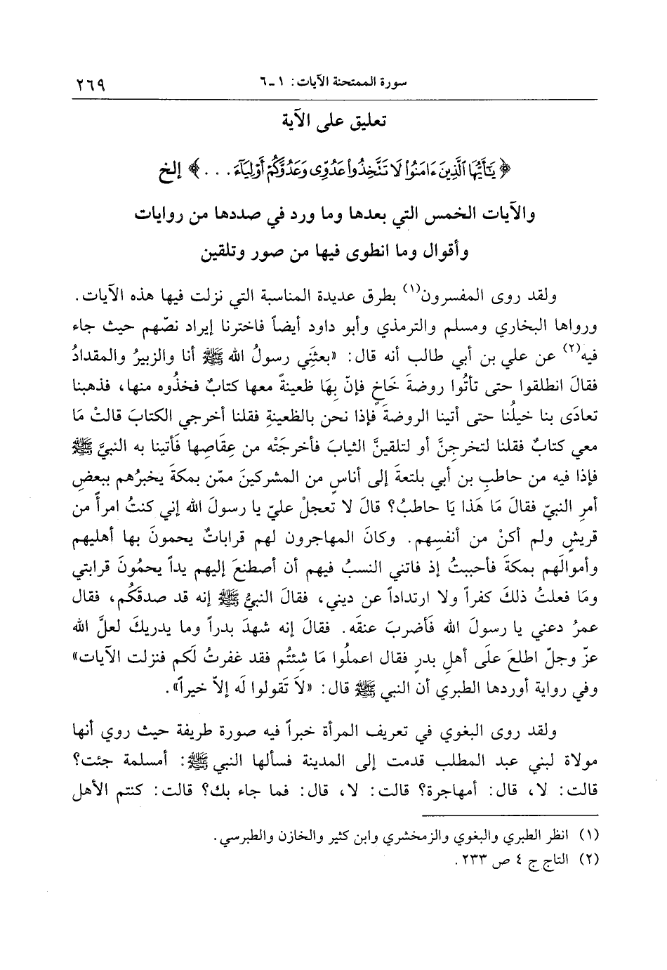 تعليق على الآية يا أَيُّهَا الَّذِينَ آمَنُوا لا تَتَّخِذُوا عَدُوِّي وَعَدُوَّكُمْ أَوْلِياءَ ... إلخ والآيات الخمس التي بعدها وما ورد في صددها من روايات وأقوال وما انطوى فيها من صور وتلقين