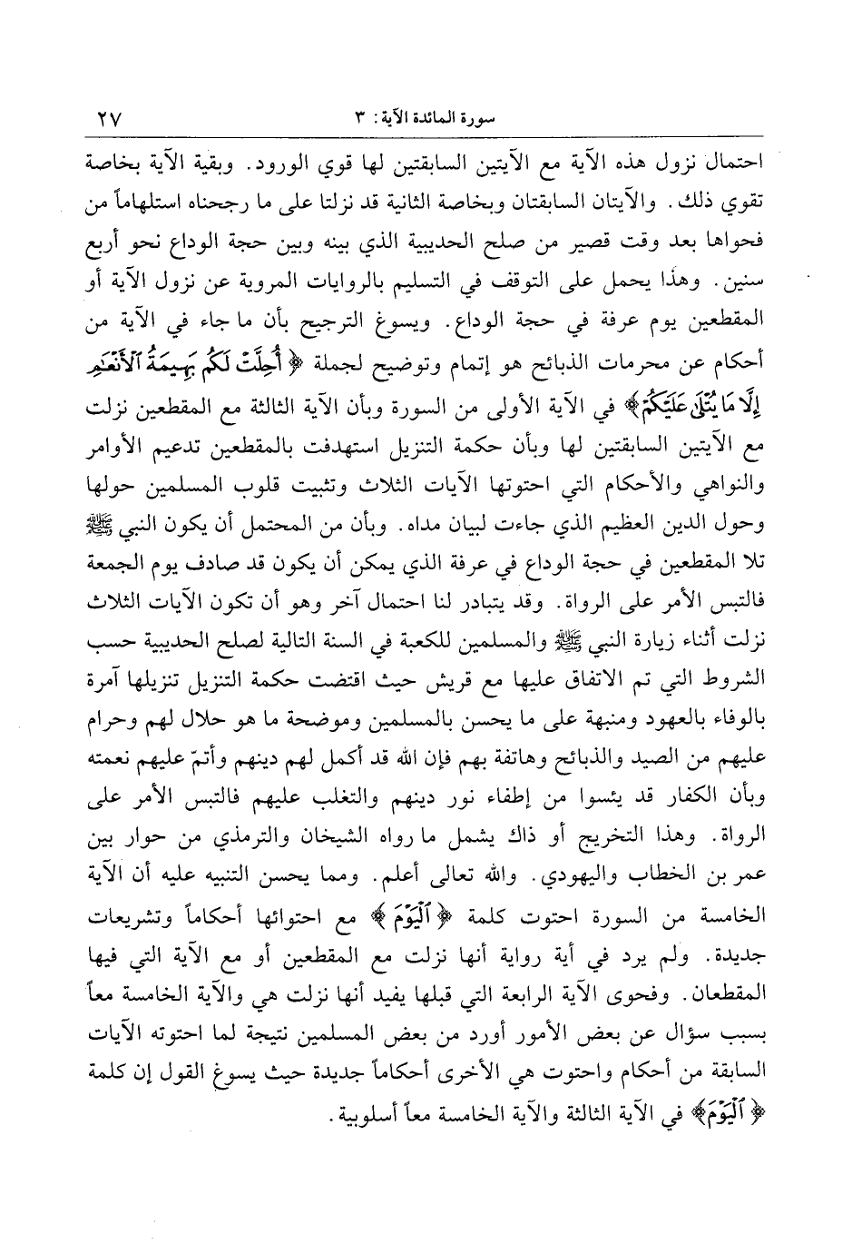 احتمال نزول هذه الآية مع الآيتين السابقتين لها قوي الورود. وبقية الآية بخاصة تقوي ذلك. والآيتان السابقتان وبخاصة الثانية قد نزلتا على ما رجحناه استلهاما من فحواها بعد وقت قصير من صلح الحديبية الذي بينه وبين حجة الوداع نحو أربع سنين. وهذا يحمل على التوقف في التسليم بالروايات المروية عن نزول الآية أو المقطعين يوم عرفة في حجة الوداع. ويسوغ الترجيح بأن ما جاء في الآية من أحكام عن محرمات الذبائح هو إتمام وتوضيح لجملة أُحِلَّتْ لَكُمْ بَهِيمَةُ الْأَنْعامِ إِلَّا ما يُتْلى عَلَيْكُمْ في الآية الأولى من السورة وبأن الآية الثالثة مع المقطعين نزلت مع الآيتين السابقتين لها وبأن حكمة التنزيل استهدفت بالمقطعين تدعيم الأوامر والنواهي والأحكام التي احتوتها الآيات الثلاث وتثبيت قلوب المسلمين حولها وحول الدين العظيم الذي جاءت لبيان مداه. وبأن من المحتمل أن يكون النبي صلى الله عليه وسلم تلا المقطعين في حجة الوداع في عرفة الذي يمكن أن يكون قد صادف يوم الجمعة فالتبس الأمر على الرواة. وقد يتبادر لنا احتمال آخر وهو أن تكون الآيات الثلاث نزلت أثناء زيارة النبي صلى الله عليه وسلم والمسلمين للكعبة في السنة التالية لصلح الحديبية حسب الشروط التي تم الاتفاق عليها مع قريش حيث اقتضت حكمة التنزيل تنزيلها آمرة بالوفاء بالعهود ومنبهة على ما يحسن بالمسلمين وموضحة ما هو حلال لهم وحرام عليهم من الصيد والذبائح وهاتفة بهم فإن الله قد أكمل لهم دينهم وأتمّ عليهم نعمته وبأن الكفار قد يئسوا من إطفاء نور دينهم والتغلب عليهم فالتبس الأمر على الرواة. وهذا التخريج أو ذاك يشمل ما رواه الشيخان والترمذي من حوار بين عمر بن الخطاب واليهودي. والله تعالى أعلم. ومما يحسن التنبيه عليه أن الآية الخامسة من السورة احتوت كلمة الْيَوْمَ مع احتوائها أحكاما وتشريعات جديدة. ولم يرد في أية رواية أنها نزلت مع المقطعين أو مع الآية التي فيها المقطعان. وفحوى الآية الرابعة التي قبلها يفيد أنها نزلت هي والآية الخامسة معا بسبب سؤال عن بعض الأمور أورد من بعض المسلمين نتيجة لما احتوته الآيات السابقة من أحكام واحتوت هي الأخرى أحكاما جديدة حيث يسوغ القول إن كلمة الْيَوْمَ في الآية الثالثة والآية الخامسة معا أسلوبية.