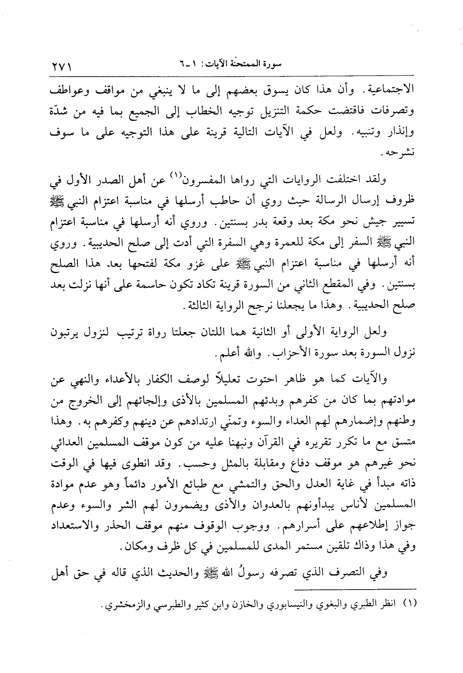 ولقد اختلفت الروايات التي رواها المفسرون «1» عن أهل الصدر الأول في ظروف إرسال الرسالة حيث روي أن حاطب أرسلها في مناسبة اعتزام النبي صلى الله عليه وسلم تسيير جيش نحو مكة بعد وقعة بدر بسنتين. وروي أنه أرسلها في مناسبة اعتزام النبي صلى الله عليه وسلم السفر إلى مكة للعمرة وهي السفرة التي أدت إلى صلح الحديبية. وروي أنه أرسلها في مناسبة اعتزام النبي صلى الله عليه وسلم على غزو مكة لفتحها بعد هذا الصلح بسنتين. وفي المقطع الثاني من السورة قرينة تكاد تكون حاسمة على أنها نزلت بعد صلح الحديبية. وهذا ما يجعلنا نرجح الرواية الثالثة.