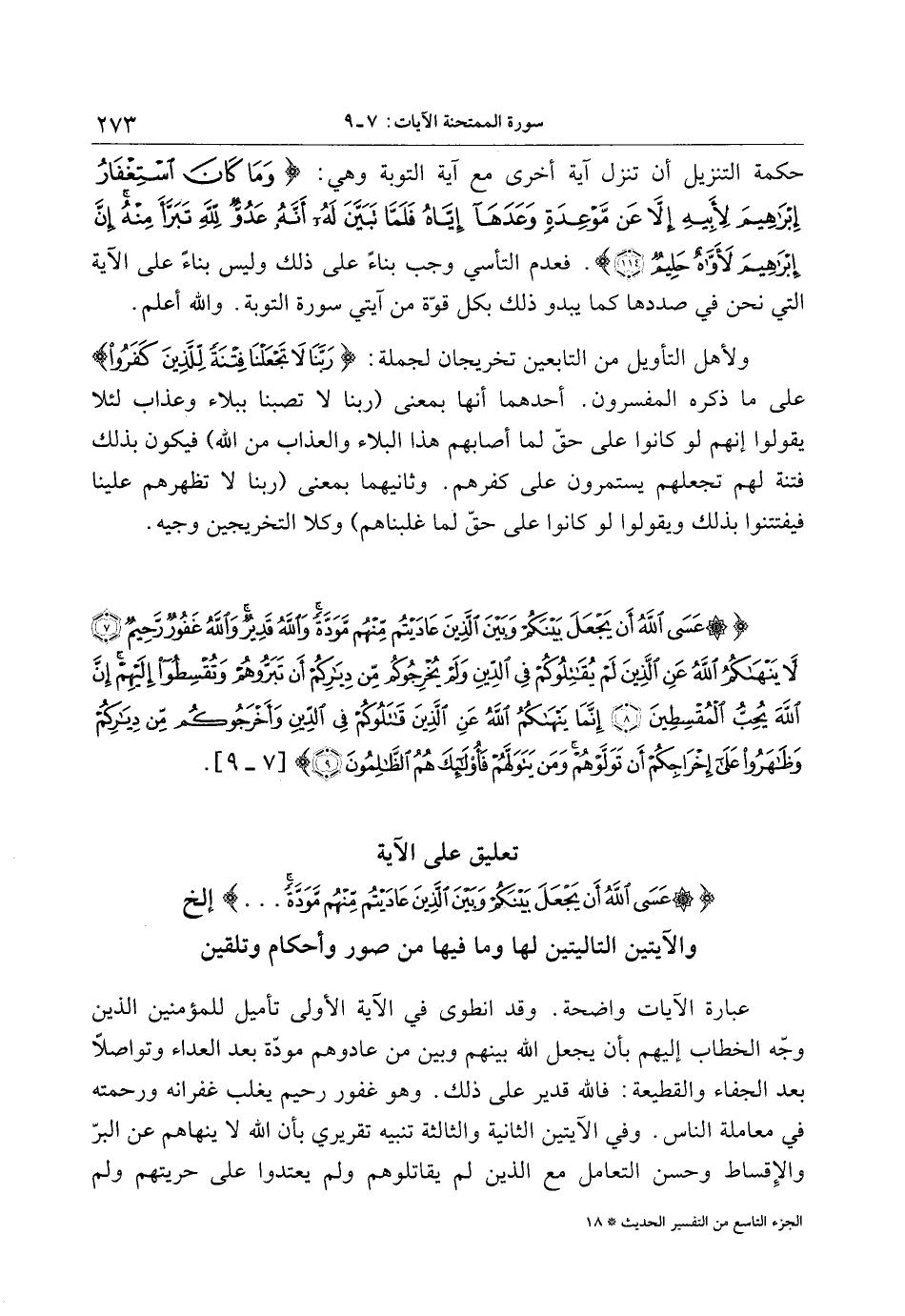 عَسَى اللَّهُ أَنْ يَجْعَلَ بَيْنَكُمْ وَبَيْنَ الَّذِينَ عادَيْتُمْ مِنْهُمْ مَوَدَّةً وَاللَّهُ قَدِيرٌ وَاللَّهُ غَفُورٌ رَحِيمٌ (7) لا يَنْهاكُمُ اللَّهُ عَنِ الَّذِينَ لَمْ يُقاتِلُوكُمْ فِي الدِّينِ وَلَمْ يُخْرِجُوكُمْ مِنْ دِيارِكُمْ أَنْ تَبَرُّوهُمْ وَتُقْسِطُوا إِلَيْهِمْ إِنَّ اللَّهَ يُحِبُّ الْمُقْسِطِينَ (8) إِنَّما يَنْهاكُمُ اللَّهُ عَنِ الَّذِينَ قاتَلُوكُمْ فِي الدِّينِ وَأَخْرَجُوكُمْ مِنْ دِيارِكُمْ وَظاهَرُوا عَلى إِخْراجِكُمْ أَنْ تَوَلَّوْهُمْ وَمَنْ يَتَوَلَّهُمْ فَأُولئِكَ هُمُ الظَّالِمُونَ (9)