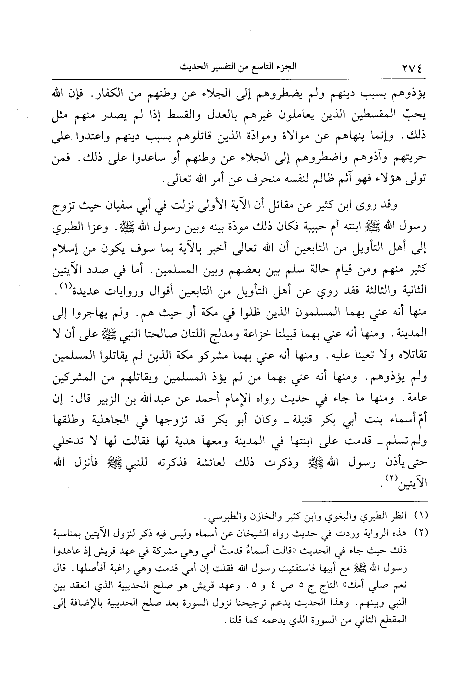 (2) هذه الرواية وردت في حديث رواه الشيخان عن أسماء وليس فيه ذكر لنزول الآيتين بمناسبة ذلك حيث جاء في الحديث «قالت أسماء قدمت أمي وهي مشركة في عهد قريش إذ عاهدوا رسول الله صلى الله عليه وسلم مع أبيها فاستفتيت رسول الله فقلت إن أمي قدمت وهي راغبة أفأصلها. قال نعم صلي أمك» التاج ج 5 ص 4 و 5. وعهد قريش هو صلح الحديبية الذي انعقد بين النبي وبينهم. وهذا الحديث يدعم ترجيحنا نزول السورة بعد صلح الحديبية بالإضافة إلى المقطع الثاني من السورة الذي يدعمه كما قلنا.