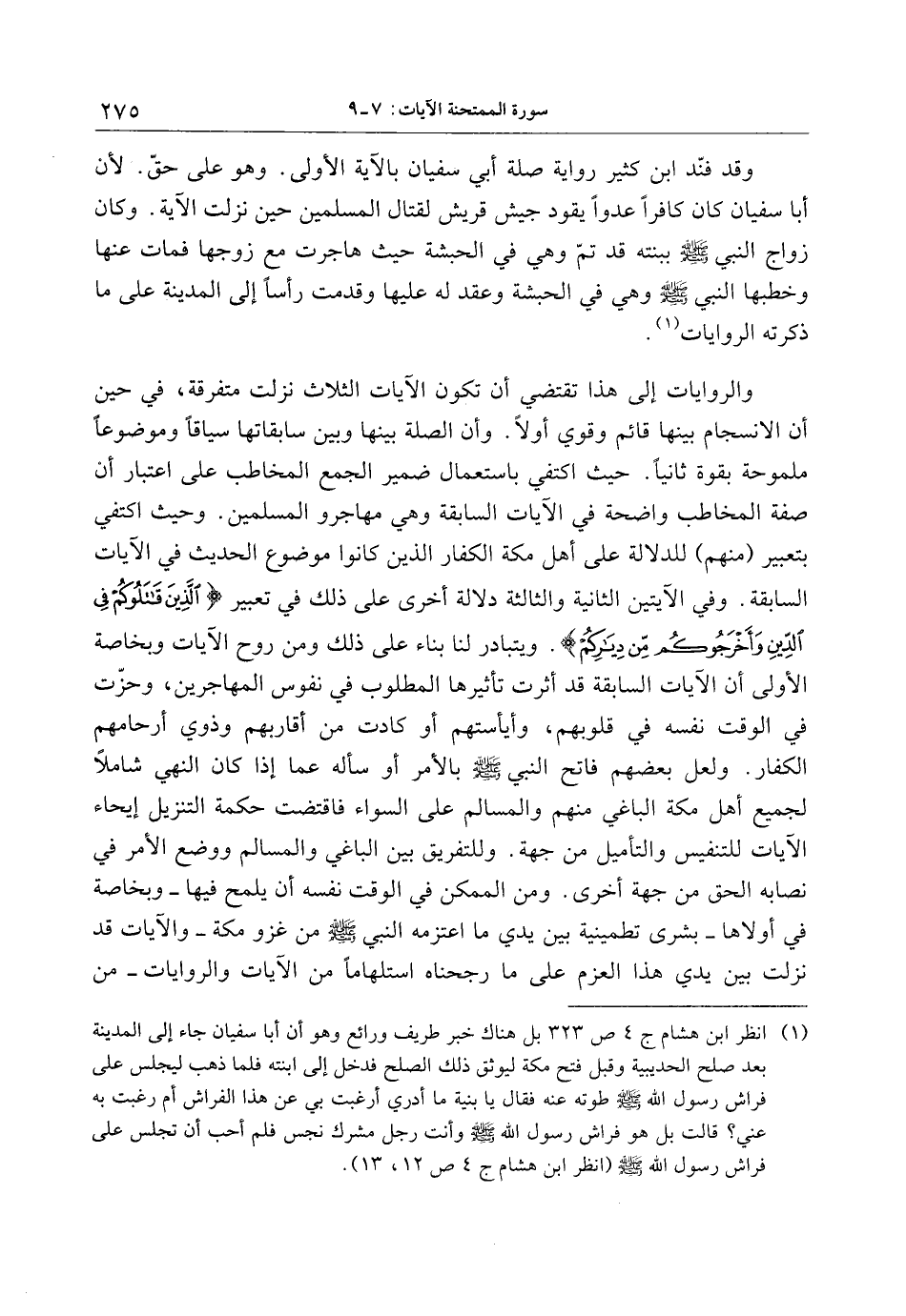 وقد فنّد ابن كثير رواية صلة أبي سفيان بالآية الأولى. وهو على حقّ. لأن أبا سفيان كان كافرا عدوا يقود جيش قريش لقتال المسلمين حين نزلت الآية. وكان زواج النبي صلى الله عليه وسلم ببنته قد تمّ وهي في الحبشة حيث هاجرت مع زوجها فمات عنها وخطبها النبي صلى الله عليه وسلم وهي في الحبشة وعقد له عليها وقدمت رأسا إلى المدينة على ما ذكرته الروايات «1» .