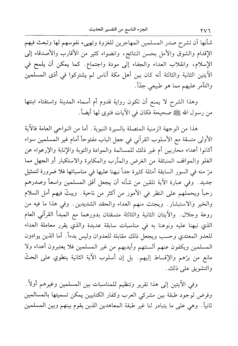 هذا من الوجهة الزمنية المتصلة بالسيرة النبوية. أما من النواحي العامة فالآية الأولى متسقة مع الأسلوب القرآني في جعل الباب مفتوحا أمام غير المسلمين سواء أكانوا أعداء محاربين أم غير ذلك للمسالمة والموادة والتوبة والإنابة والارعواء عن الغلو والمواقف المنبثقة من الغرض والمآرب والمكابرة والاستكبار أو الجهل مما مرّ منه في السور السابقة أمثلة كثيرة جدا نبهنا عليها في مناسباتها فلا ضرورة لتمثيل جديد. وفي عبارة الآية تلقين من شأنه أن يجعل أفق المسلمين واسعا وصدرهم رحبا ويحملهم على النظر في الأمور من أكثر من ناحية. ويبثّ فيهم أمل السلام والخير والاستبشار. ويجتث منهم العداء والحقد الشديدين. وفي هذا ما فيه من روعة وجلال. والآيتان الثانية والثالثة متسقتان بدورهما مع المبدأ القرآني العام الذي نبهنا عليه ونوهنا به في مناسبات سابقة عديدة والذي يقرر معاملة العداء للعدو المعتدي وحسب ويجعل ذلك مقابلة للعدوان وليس بدءا. أما الذين يوادون المسلمين ويكفون عنهم ألسنتهم وأيديهم من غير المسلمين فلا يعتبرون أعداء ولا مانع من برّهم والإقساط إليهم. بل إن أسلوب الآية الثانية ينطوي على الحثّ والتشويق على ذلك.