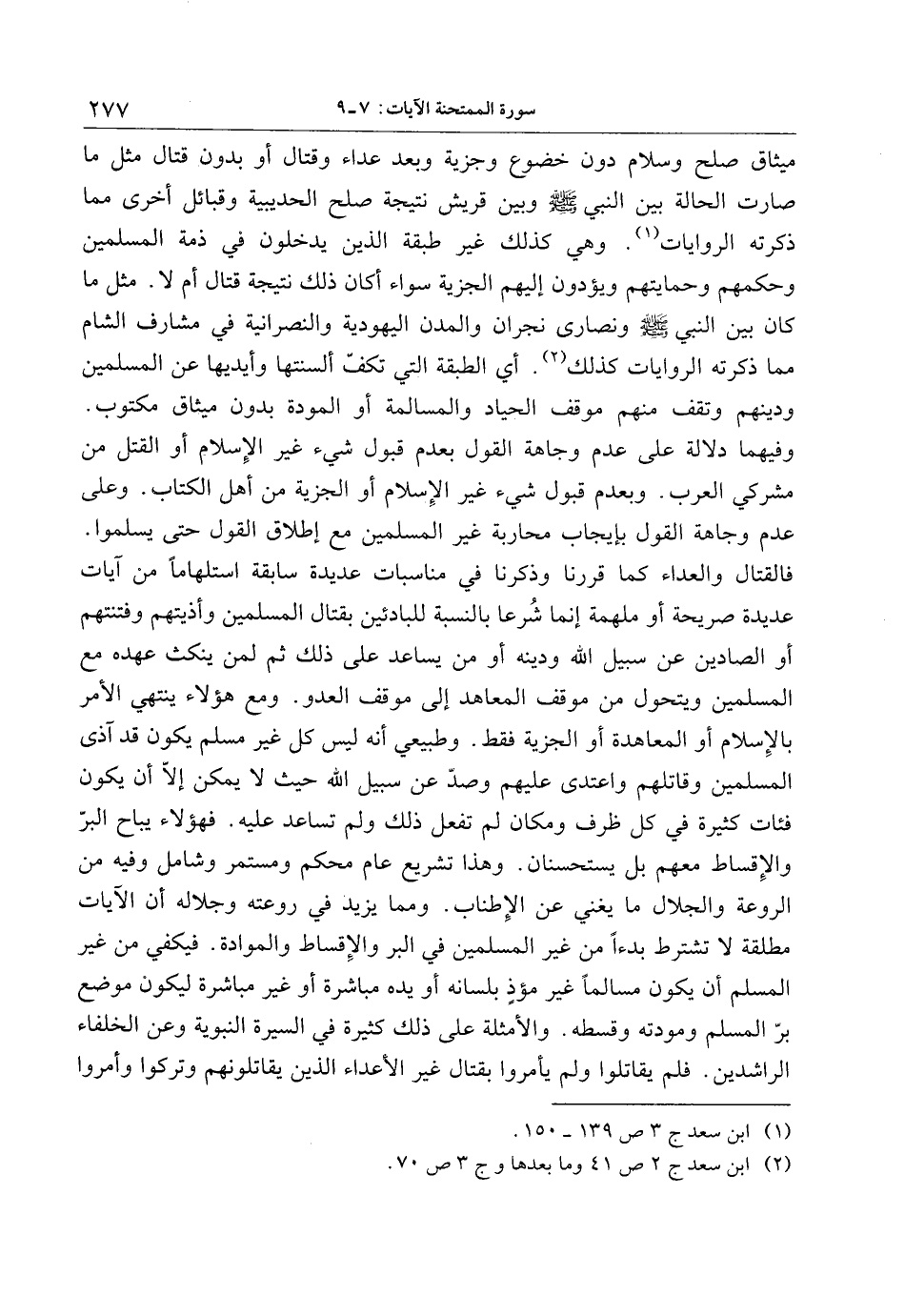 ميثاق صلح وسلام دون خضوع وجزية وبعد عداء وقتال أو بدون قتال مثل ما صارت الحالة بين النبي صلى الله عليه وسلم وبين قريش نتيجة صلح الحديبية وقبائل أخرى مما ذكرته الروايات «1» . وهي كذلك غير طبقة الذين يدخلون في ذمة المسلمين وحكمهم وحمايتهم ويؤدون إليهم الجزية سواء أكان ذلك نتيجة قتال أم لا. مثل ما كان بين النبي صلى الله عليه وسلم ونصارى نجران والمدن اليهودية والنصرانية في مشارف الشام مما ذكرته الروايات كذلك «2» . أي الطبقة التي تكفّ ألسنتها وأيديها عن المسلمين ودينهم وتقف منهم موقف الحياد والمسالمة أو المودة بدون ميثاق مكتوب.