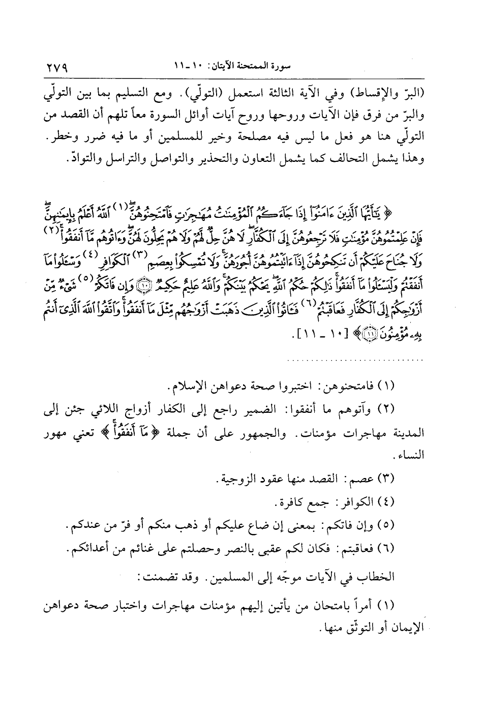 يا أَيُّهَا الَّذِينَ آمَنُوا إِذا جاءَكُمُ الْمُؤْمِناتُ مُهاجِراتٍ فَامْتَحِنُوهُنَّ اللَّهُ أَعْلَمُ بِإِيمانِهِنَّ فَإِنْ عَلِمْتُمُوهُنَّ مُؤْمِناتٍ فَلا تَرْجِعُوهُنَّ إِلَى الْكُفَّارِ لا هُنَّ حِلٌّ لَهُمْ وَلا هُمْ يَحِلُّونَ لَهُنَّ وَآتُوهُمْ ما أَنْفَقُوا وَلا جُناحَ عَلَيْكُمْ أَنْ تَنْكِحُوهُنَّ إِذا آتَيْتُمُوهُنَّ أُجُورَهُنَّ وَلا تُمْسِكُوا بِعِصَمِ الْكَوافِرِ وَسْئَلُوا ما أَنْفَقْتُمْ وَلْيَسْئَلُوا ما أَنْفَقُوا ذلِكُمْ حُكْمُ اللَّهِ يَحْكُمُ بَيْنَكُمْ وَاللَّهُ عَلِيمٌ حَكِيمٌ (10) وَإِنْ فاتَكُمْ شَيْءٌ مِنْ أَزْواجِكُمْ إِلَى الْكُفَّارِ فَعاقَبْتُمْ فَآتُوا الَّذِينَ ذَهَبَتْ أَزْواجُهُمْ مِثْلَ ما أَنْفَقُوا وَاتَّقُوا اللَّهَ الَّذِي أَنْتُمْ بِهِ مُؤْمِنُونَ (11)