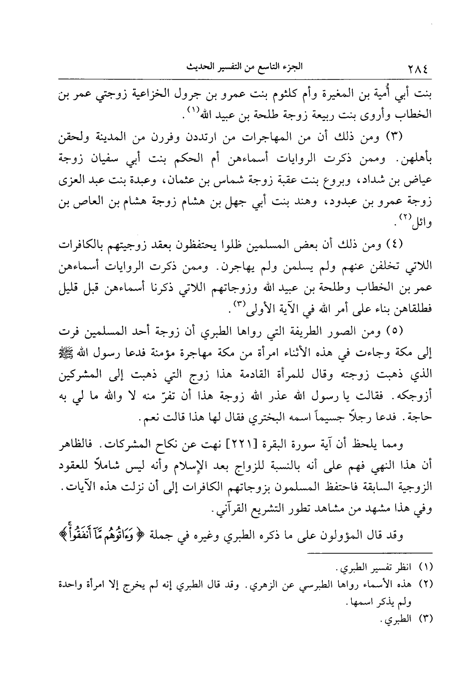 (4) ومن ذلك أن بعض المسلمين ظلوا يحتفظون بعقد زوجيتهم بالكافرات اللاتي تخلفن عنهم ولم يسلمن ولم يهاجرن. وممن ذكرت الروايات أسماءهن عمر بن الخطاب وطلحة بن عبيد الله وزوجاتهم اللاتي ذكرنا أسماءهن قبل قليل فطلقاهن بناء على أمر الله في الآية الأولى «3» .