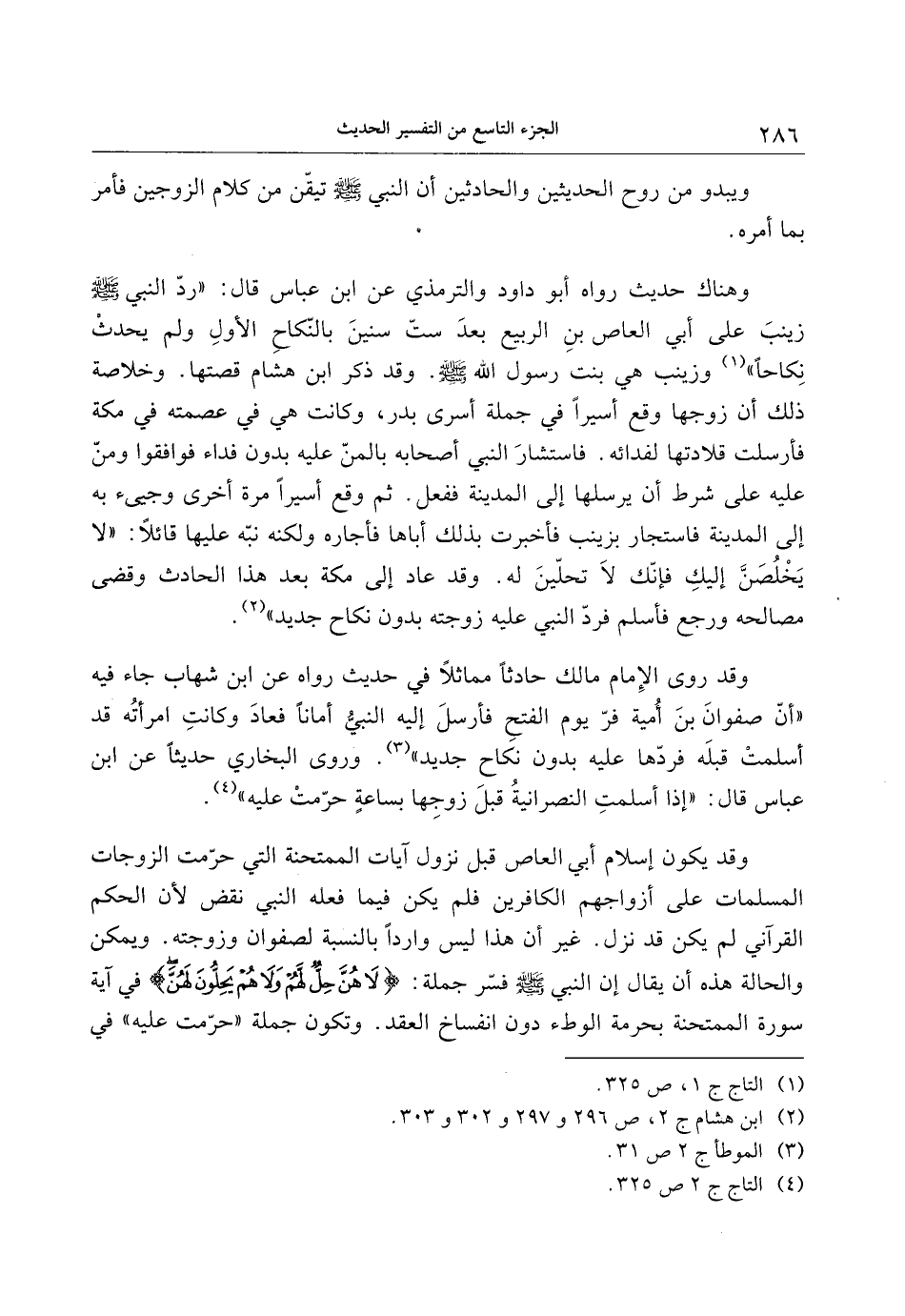 وقد روى الإمام مالك حادثا مماثلا في حديث رواه عن ابن شهاب جاء فيه «أنّ صفوان بن أمية فرّ يوم الفتح فأرسل إليه النبيّ أمانا فعاد وكانت امرأته قد أسلمت قبله فردّها عليه بدون نكاح جديد» «3» . وروى البخاري حديثا عن ابن عباس قال: «إذا أسلمت النصرانية قبل زوجها بساعة حرّمت عليه» «4» .