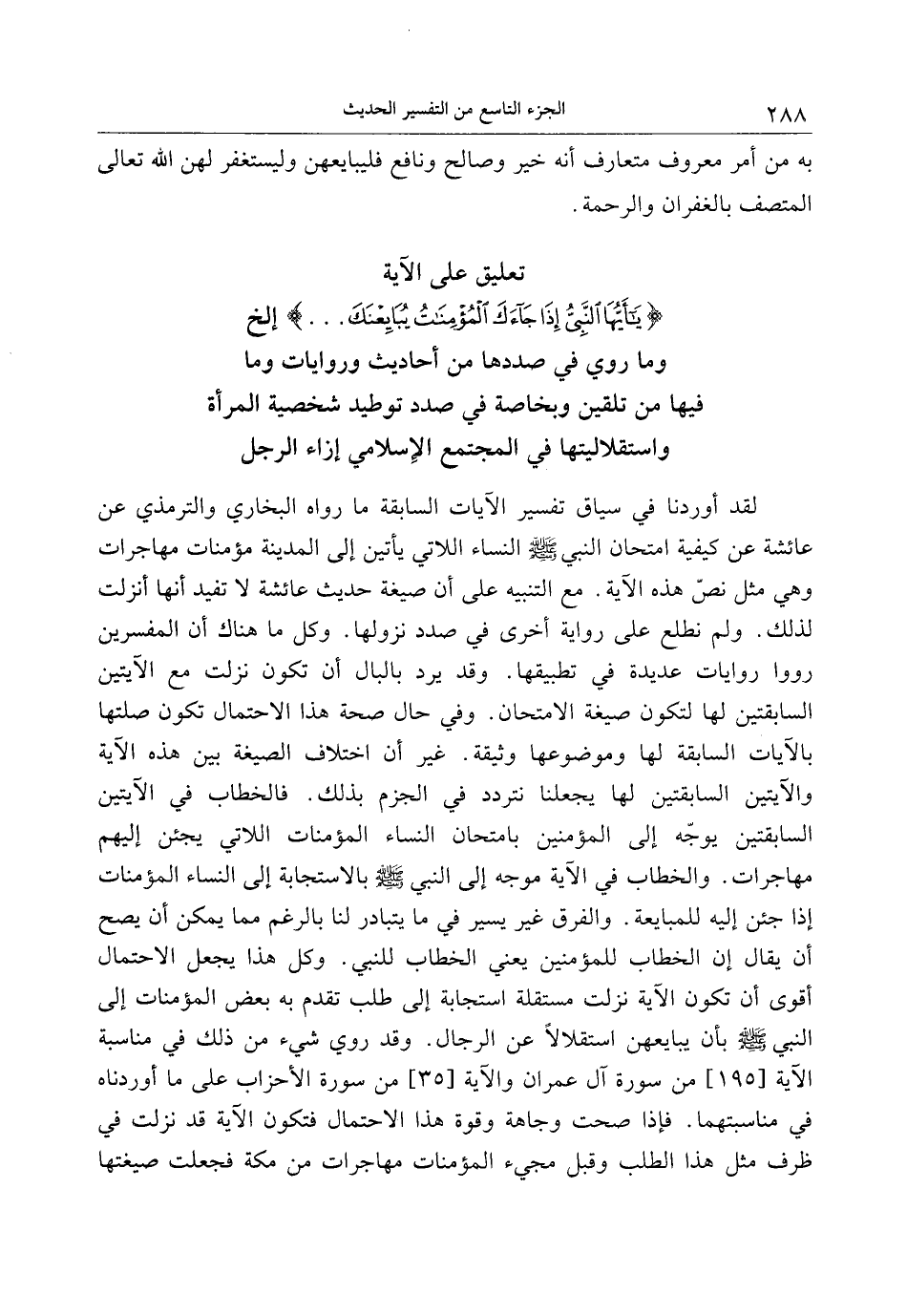 تعليق على الآية يا أَيُّهَا النَّبِيُّ إِذا جاءَكَ الْمُؤْمِناتُ يُبايِعْنَكَ ... إلخ وما روي في صددها من أحاديث وروايات وما فيها من تلقين وبخاصة في صدد توطيد شخصية المرأة واستقلاليتها في المجتمع الإسلامي إزاء الرجل