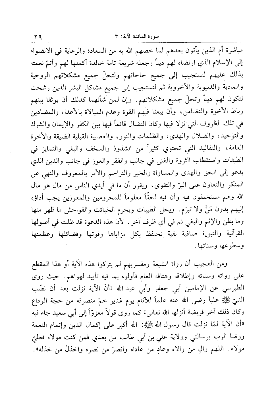 ومن العجيب أن رواة الشيعة ومفسريهم لم يتركوا هذه الآية أو هذا المقطع على روائه وسنائه وإطلاقه وهتافه العام فأولوه بما فيه تأييد لهواهم. حيث روى الطبرسي عن الإمامين أبي جعفر وأبي عبد الله «أنّ الآية نزلت بعد أن نصّب النبيّ صلى الله عليه وسلم عليا رضي الله عنه علما للأنام يوم غدير خمّ منصرفه من حجة الوداع وكان ذلك آخر فريضة أنزلها الله تعالى» كما روى قولا معزوّا إلى أبي سعيد جاء فيه «أن الآية لمّا نزلت قال رسول الله صلى الله عليه وسلم: الله أكبر على إكمال الدين وإتمام النعمة ورضا الرب برسالتي وولاية علي بن أبي طالب من بعدي فمن كنت مولاه فعليّ مولاه. اللهم وال من والاه وعاد من عاداه وانصر من نصره واخذل من خذله» .