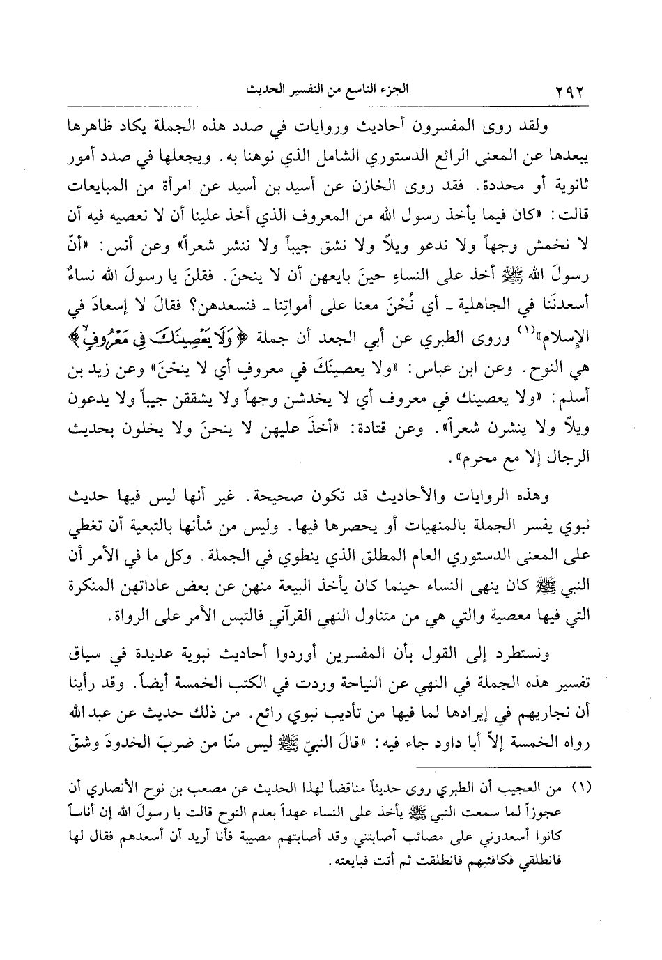 ونستطرد إلى القول بأن المفسرين أوردوا أحاديث نبوية عديدة في سياق تفسير هذه الجملة في النهي عن النياحة وردت في الكتب الخمسة أيضا. وقد رأينا أن نجاريهم في إيرادها لما فيها من تأديب نبوي رائع. من ذلك حديث عن عبد الله رواه الخمسة إلّا أبا داود جاء فيه: «قال النبيّ صلى الله عليه وسلم ليس منّا من ضرب الخدود وشقّ