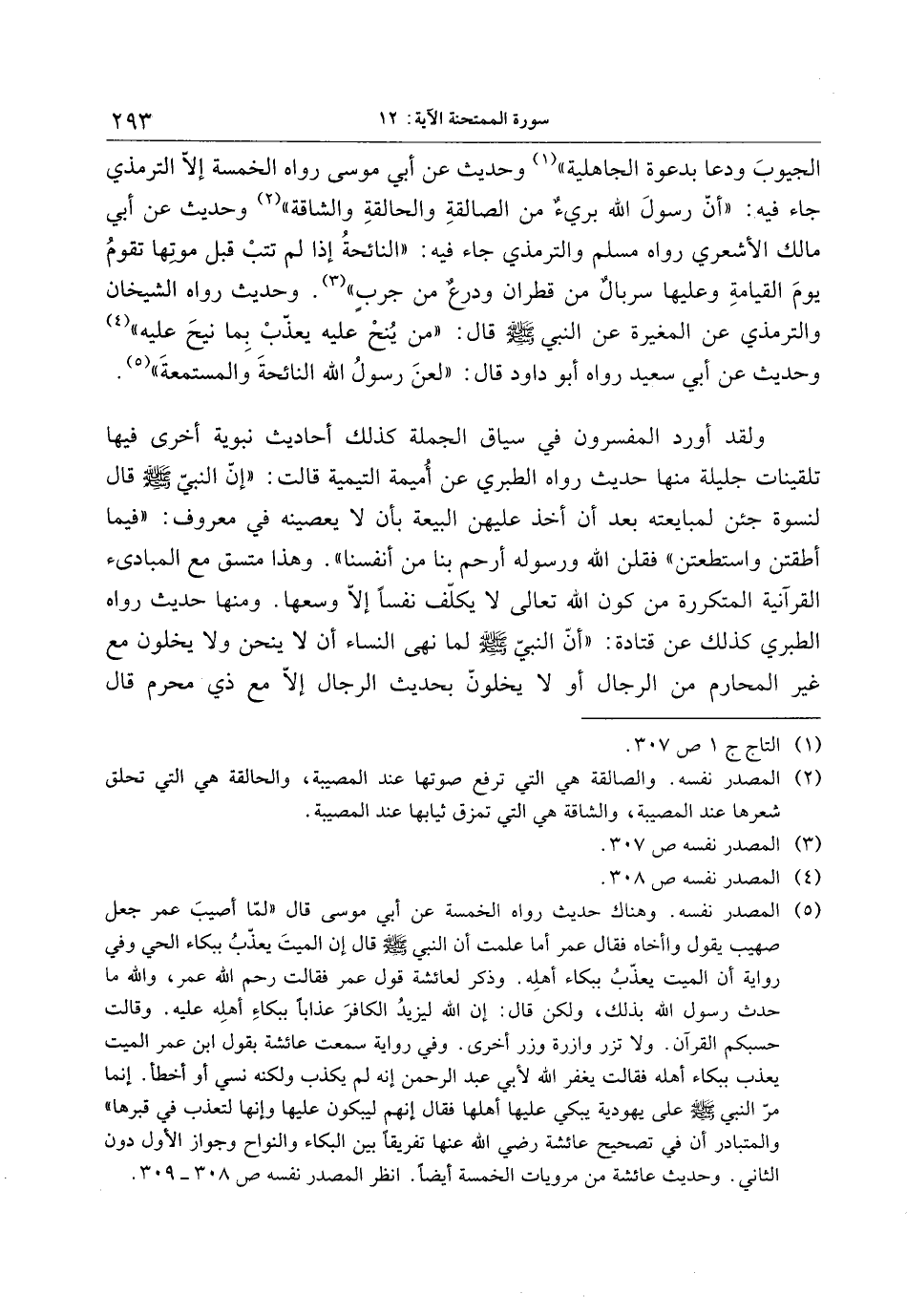 (2) المصدر نفسه. والصالقة هي التي ترفع صوتها عند المصيبة، والحالقة هي التي تحلق شعرها عند المصيبة، والشاقة هي التي تمزق ثيابها عند المصيبة.