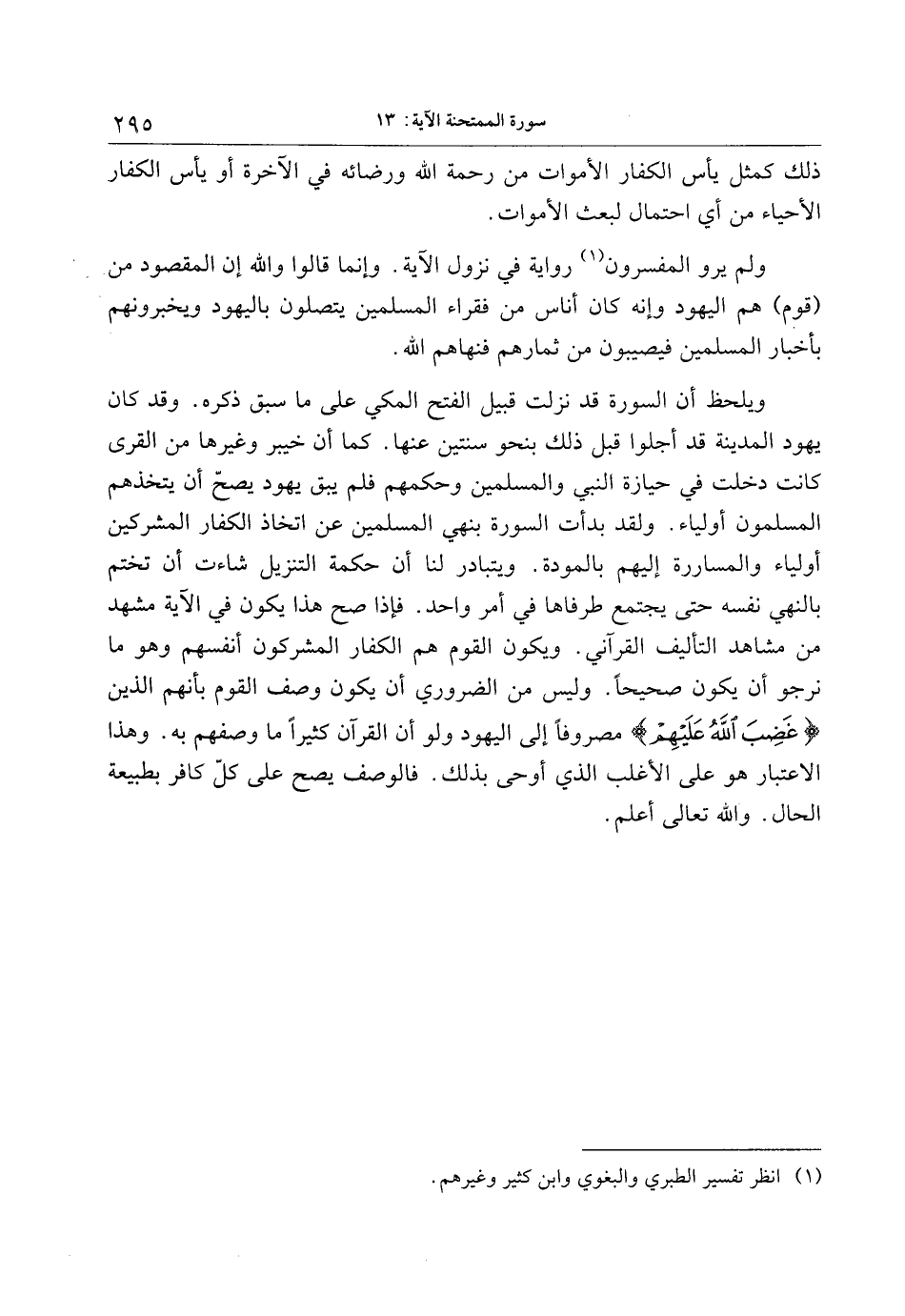 ويلحظ أن السورة قد نزلت قبيل الفتح المكي على ما سبق ذكره. وقد كان يهود المدينة قد أجلوا قبل ذلك بنحو سنتين عنها. كما أن خيبر وغيرها من القرى كانت دخلت في حيازة النبي والمسلمين وحكمهم فلم يبق يهود يصحّ أن يتخذهم المسلمون أولياء. ولقد بدأت السورة بنهي المسلمين عن اتخاذ الكفار المشركين أولياء والمساررة إليهم بالمودة. ويتبادر لنا أن حكمة التنزيل شاءت أن تختم بالنهي نفسه حتى يجتمع طرفاها في أمر واحد. فإذا صح هذا يكون في الآية مشهد من مشاهد التأليف القرآني. ويكون القوم هم الكفار المشركون أنفسهم وهو ما نرجو أن يكون صحيحا. وليس من الضروري أن يكون وصف القوم بأنهم الذين غَضِبَ اللَّهُ عَلَيْهِمْ مصروفا إلى اليهود ولو أن القرآن كثيرا ما وصفهم به. وهذا الاعتبار هو على الأغلب الذي أوحى بذلك. فالوصف يصح على كلّ كافر بطبيعة الحال. والله تعالى أعلم.