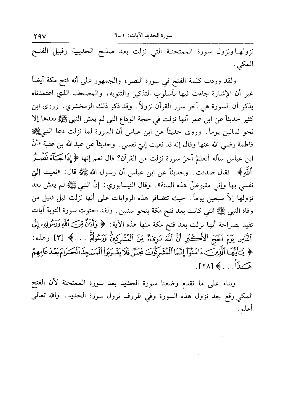 وبناء على ما تقدم وضعنا سورة الحديد بعد سورة الممتحنة لأن الفتح المكي وقع بعد نزول هذه السورة وفي ظروف نزول سورة الحديد. والله تعالى أعلم.