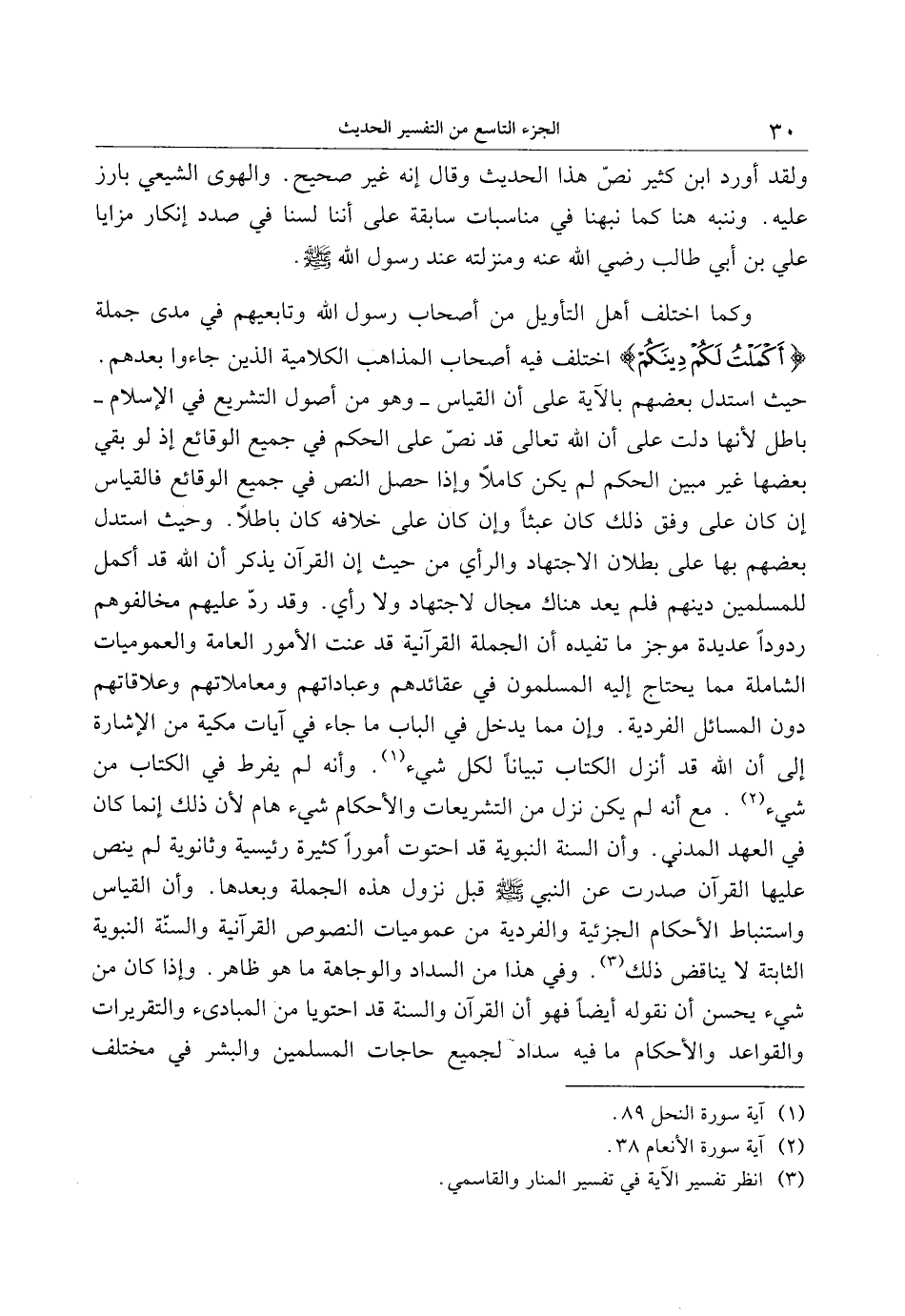 حيث استدل بعضهم بالآية على أن القياس- وهو من أصول التشريع في الإسلام- باطل لأنها دلت على أن الله تعالى قد نصّ على الحكم في جميع الوقائع إذ لو بقي بعضها غير مبين الحكم لم يكن كاملا وإذا حصل النص في جميع الوقائع فالقياس إن كان على وفق ذلك كان عبثا وإن كان على خلافه كان باطلا. وحيث استدل بعضهم بها على بطلان الاجتهاد والرأي من حيث إن القرآن يذكر أن الله قد أكمل للمسلمين دينهم فلم يعد هناك مجال لاجتهاد ولا رأي. وقد ردّ عليهم مخالفوهم ردودا عديدة موجز ما تفيده أن الجملة القرآنية قد عنت الأمور العامة والعمومات الشاملة مما يحتاج إليه المسلمون في عقائدهم وعباداتهم ومعاملاتهم وعلاقاتهم دون المسائل الفردية. وإن مما يدخل في الباب ما جاء في آيات مكية من الإشارة إلى أن الله قد أنزل الكتاب تبيانا لكل شيء «1» . وأنه لم يفرط في الكتاب من شيء «2» . مع أنه لم يكن نزل من التشريعات والأحكام شيء هام لأن ذلك إنما كان في العهد المدني. وأن السنة النبوية قد احتوت أمورا كثيرة رئيسية وثانوية لم ينص عليها القرآن صدرت عن النبي صلى الله عليه وسلم قبل نزول هذه الجملة وبعدها. وأن القياس واستنباط الأحكام الجزئية والفردية من عموميات النصوص القرآنية والسنّة النبوية الثابتة لا يناقض ذلك «3» . وفي هذا من السداد والوجاهة ما هو ظاهر. وإذا كان من شيء يحسن أن نقوله أيضا فهو أن القرآن والسنة قد احتويا من المبادئ والتقريرات والقواعد والأحكام ما فيه سداد لجميع حاجات المسلمين والبشر في مختلف