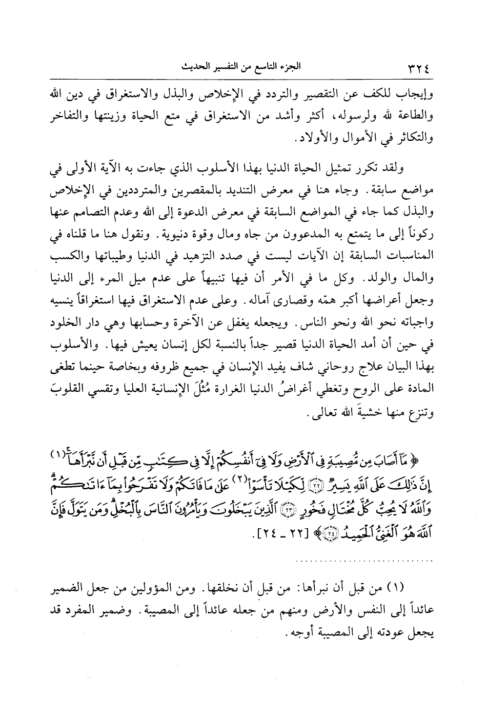 . (1) من قبل أن نبرأها: من قبل أن نخلقها. ومن المؤولين من جعل الضمير عائدا إلى النفس والأرض ومنهم من جعله عائدا إلى المصيبة. وضمير المفرد قد يجعل عودته إلى المصيبة أوجه.