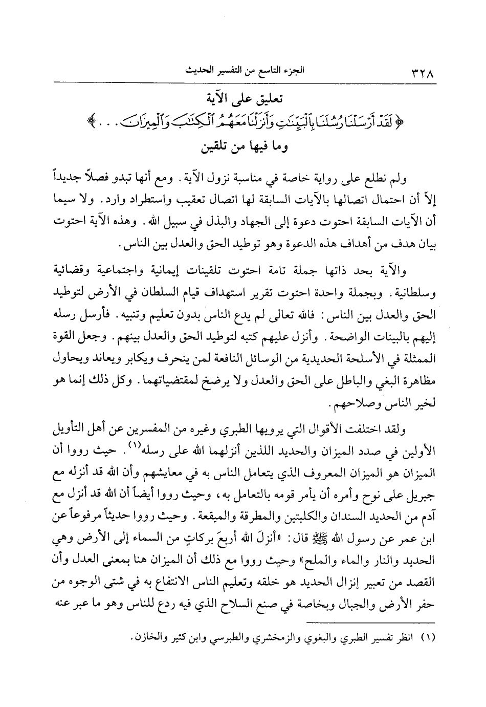 ولقد اختلفت الأقوال التي يرويها الطبري وغيره من المفسرين عن أهل التأويل الأولين في صدد الميزان والحديد اللذين أنزلهما الله على رسله»