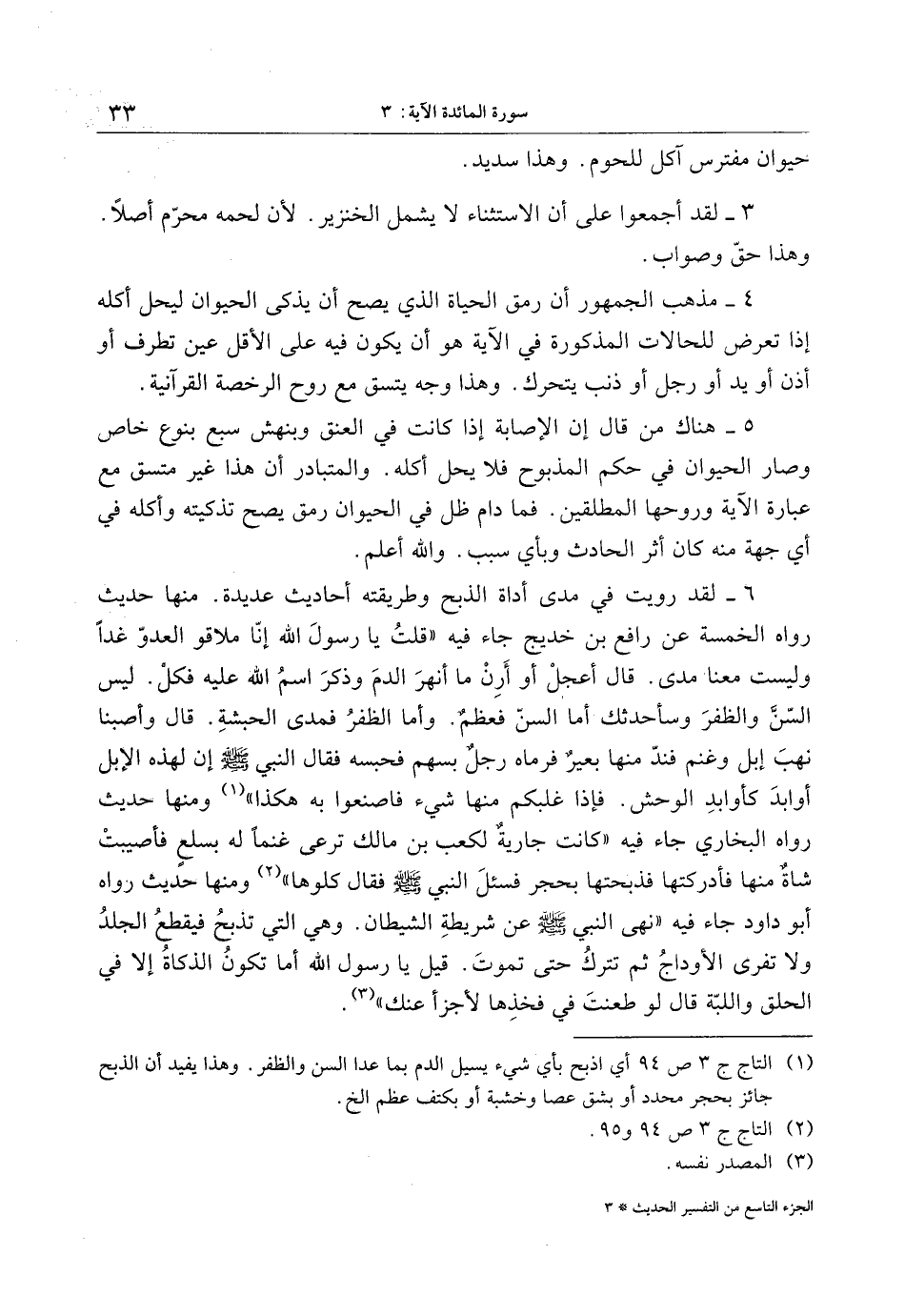 5- هناك من قال إن الإصابة إذا كانت في العنق وبنهش سبع بنوع خاص وصار الحيوان في حكم المذبوح فلا يحل أكله. والمتبادر أن هذا غير متسق مع عبارة الآية وروحها المطلقين. فما دام ظل في الحيوان رمق يصح تذكيته وأكله في أي جهة منه كان أثر الحادث وبأي سبب. والله أعلم.