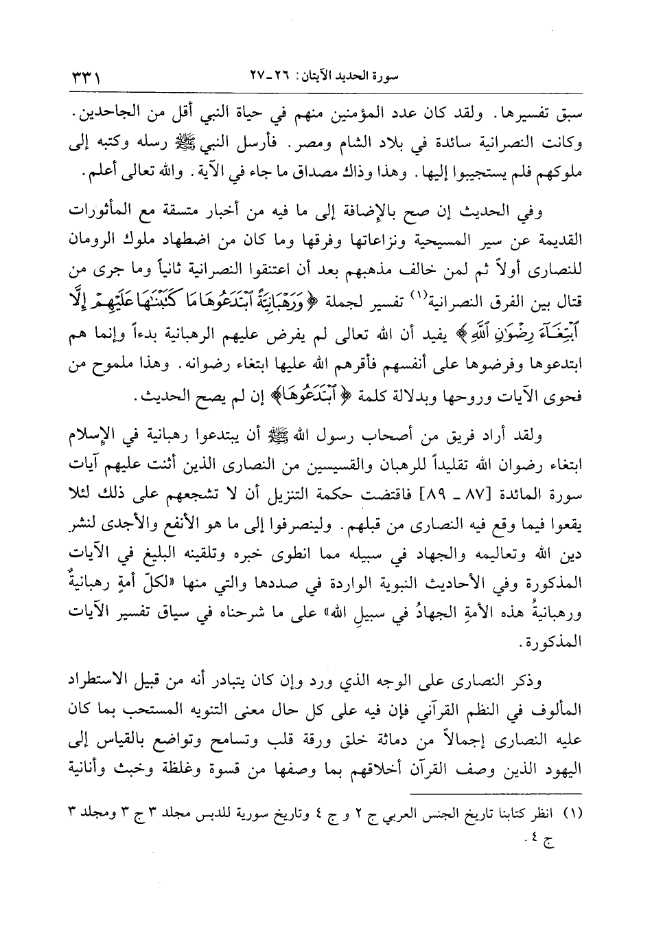 وفي الحديث إن صح بالإضافة إلى ما فيه من أخبار متسقة مع المأثورات القديمة عن سير المسيحية ونزاعاتها وفرقها وما كان من اضطهاد ملوك الرومان للنصارى أولا ثم لمن خالف مذهبهم بعد أن اعتنقوا النصرانية ثانيا وما جرى من قتال بين الفرق النصرانية «1» تفسير لجملة وَرَهْبانِيَّةً ابْتَدَعُوها ما كَتَبْناها عَلَيْهِمْ إِلَّا ابْتِغاءَ رِضْوانِ اللَّهِ يفيد أن الله تعالى لم يفرض عليهم الرهبانية بدءا وإنما هم ابتدعوها وفرضوها على أنفسهم فأقرهم الله عليها ابتغاء رضوانه. وهذا ملموح من فحوى الآيات وروحها وبدلالة كلمة ابْتَدَعُوها إن لم يصح الحديث.