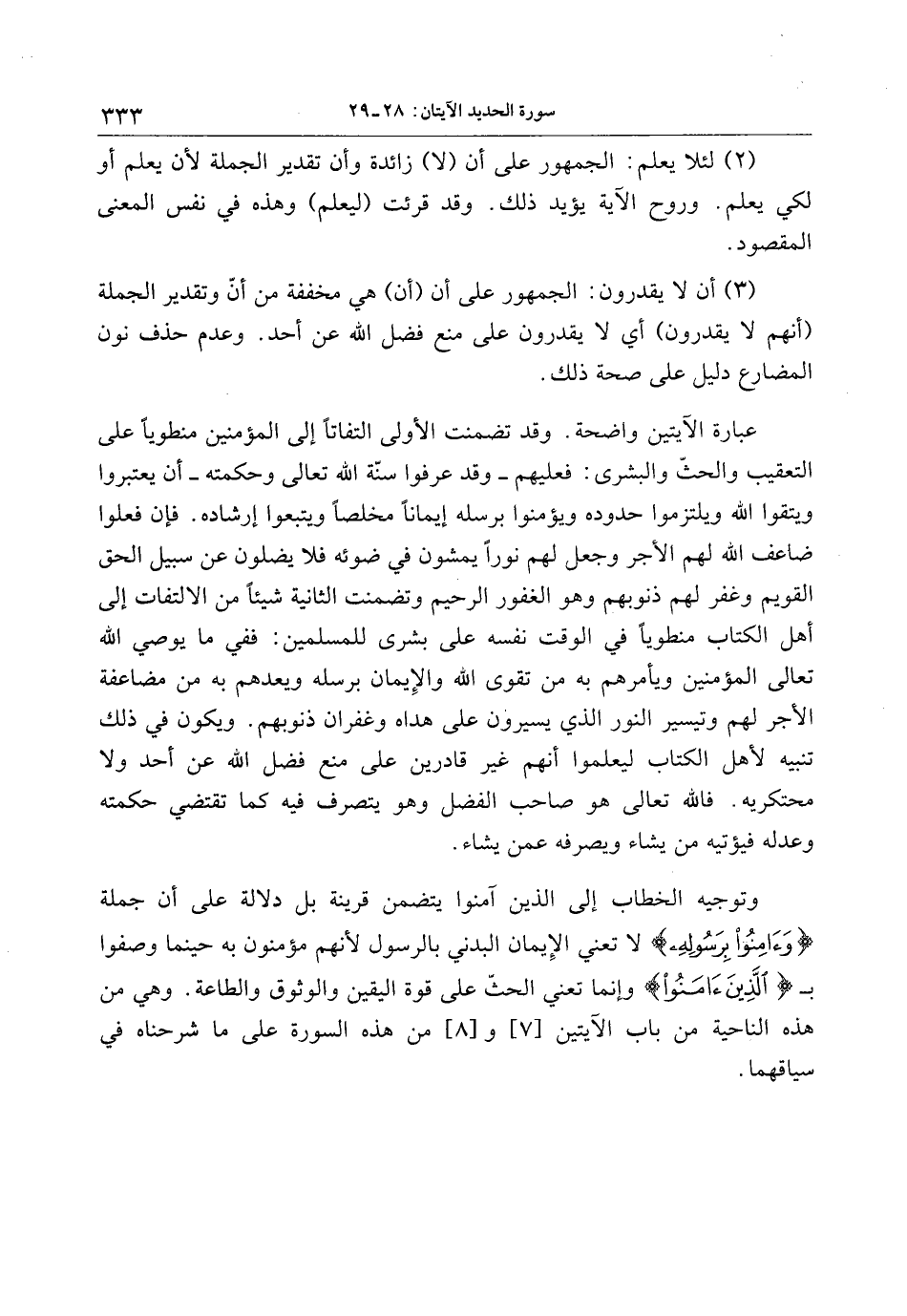 عبارة الآيتين واضحة. وقد تضمنت الأولى التفاتا إلى المؤمنين منطويا على التعقيب والحثّ والبشرى: فعليهم- وقد عرفوا سنّة الله تعالى وحكمته- أن يعتبروا ويتقوا الله ويلتزموا حدوده ويؤمنوا برسله إيمانا مخلصا ويتبعوا إرشاده. فإن فعلوا ضاعف الله لهم الأجر وجعل لهم نورا يمشون في ضوئه فلا يضلون عن سبيل الحق القويم وغفر لهم ذنوبهم وهو الغفور الرحيم وتضمنت الثانية شيئا من الالتفات إلى أهل الكتاب منطويا في الوقت نفسه على بشرى للمسلمين: ففي ما يوصي الله تعالى المؤمنين ويأمرهم به من تقوى الله والإيمان برسله ويعدهم به من مضاعفة الأجر لهم وتيسير النور الذي يسيرون على هداه وغفران ذنوبهم. ويكون في ذلك تنبيه لأهل الكتاب ليعلموا أنهم غير قادرين على منع فضل الله عن أحد ولا محتكريه. فالله تعالى هو صاحب الفضل وهو يتصرف فيه كما تقتضي حكمته وعدله فيؤتيه من يشاء ويصرفه عمن يشاء.
