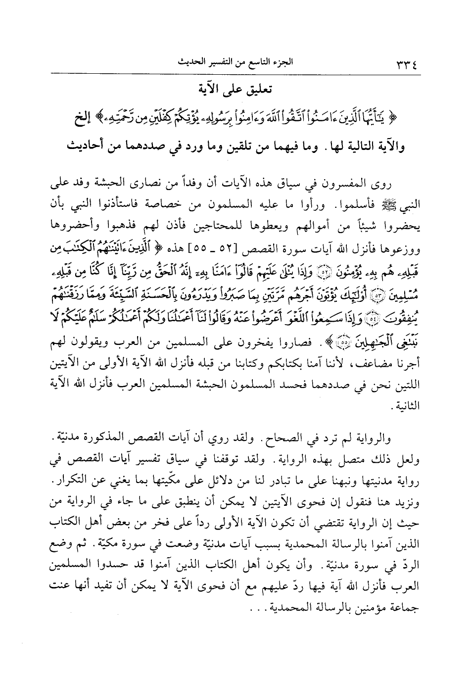 روى المفسرون في سياق هذه الآيات أن وفدا من نصارى الحبشة وفد على النبي صلى الله عليه وسلم فأسلموا. ورأوا ما عليه المسلمون من خصاصة فاستأذنوا النبي بأن يحضروا شيئا من أموالهم ويعطوها للمحتاجين فأذن لهم فذهبوا وأحضروها ووزعوها فأنزل الله آيات سورة القصص [52- 55] هذه الَّذِينَ آتَيْناهُمُ الْكِتابَ مِنْ قَبْلِهِ هُمْ بِهِ يُؤْمِنُونَ (52) وَإِذا يُتْلى عَلَيْهِمْ قالُوا آمَنَّا بِهِ إِنَّهُ الْحَقُّ مِنْ رَبِّنا إِنَّا كُنَّا مِنْ قَبْلِهِ مُسْلِمِينَ (53) أُولئِكَ يُؤْتَوْنَ أَجْرَهُمْ مَرَّتَيْنِ بِما صَبَرُوا وَيَدْرَؤُنَ بِالْحَسَنَةِ السَّيِّئَةَ وَمِمَّا رَزَقْناهُمْ يُنْفِقُونَ (54) وَإِذا سَمِعُوا اللَّغْوَ أَعْرَضُوا عَنْهُ وَقالُوا لَنا أَعْمالُنا وَلَكُمْ أَعْمالُكُمْ سَلامٌ عَلَيْكُمْ لا نَبْتَغِي الْجاهِلِينَ (55) . فصاروا يفخرون على المسلمين من العرب ويقولون لهم أجرنا مضاعف، لأننا آمنا بكتابكم وكتابنا من قبله فأنزل الله الآية الأولى من الآيتين اللتين نحن في صددهما فحسد المسلمون الحبشة المسلمين العرب فأنزل الله الآية الثانية.
