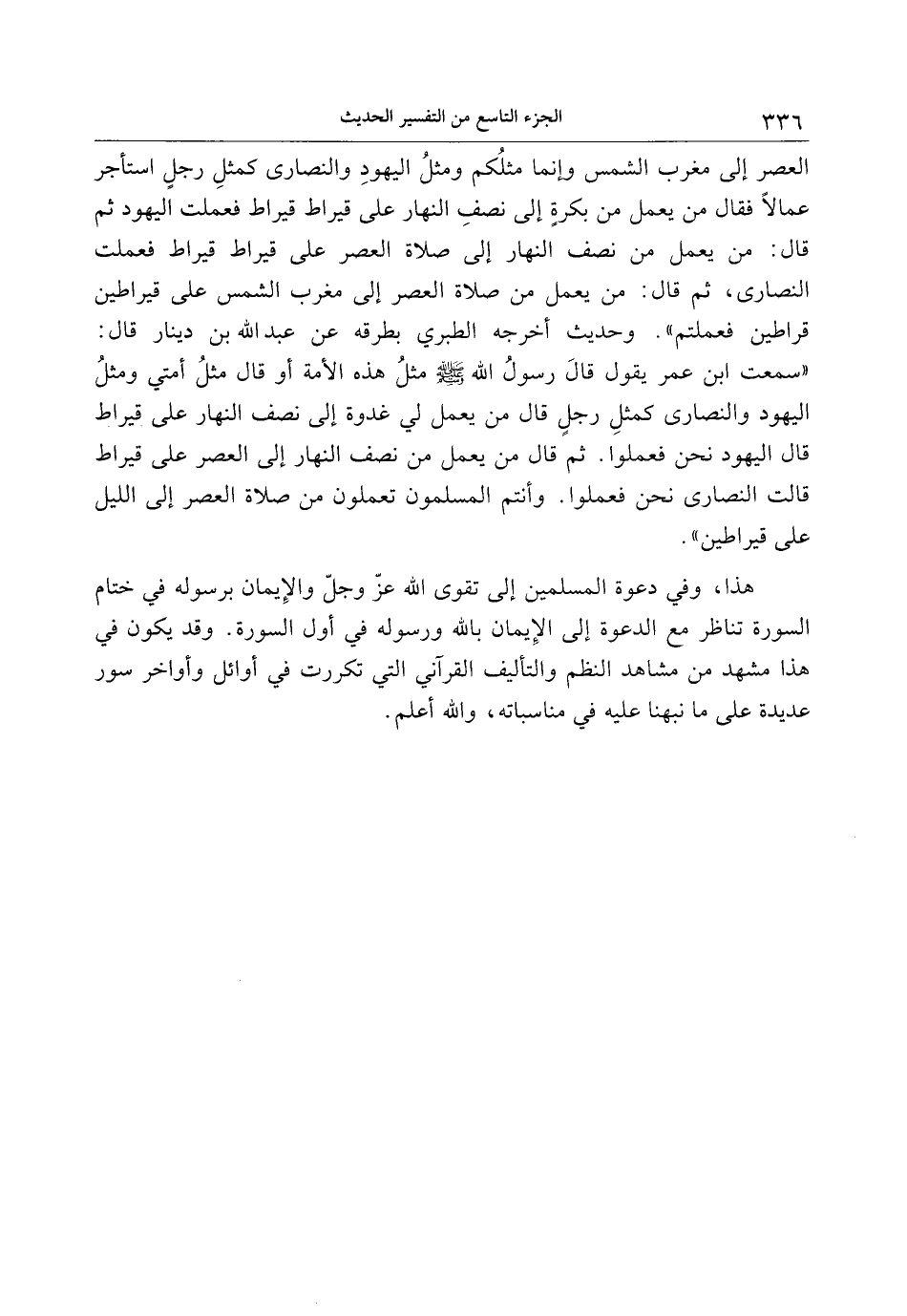 العصر إلى مغرب الشمس وإنما مثلكم ومثل اليهود والنصارى كمثل رجل استأجر عمالا فقال من يعمل من بكرة إلى نصف النهار على قيراط قيراط فعملت اليهود ثم قال: من يعمل من نصف النهار إلى صلاة العصر على قيراط قيراط فعملت النصارى، ثم قال: من يعمل من صلاة العصر إلى مغرب الشمس على قيراطين قراطين فعملتم» . وحديث أخرجه الطبري بطرقه عن عبد الله بن دينار قال:
