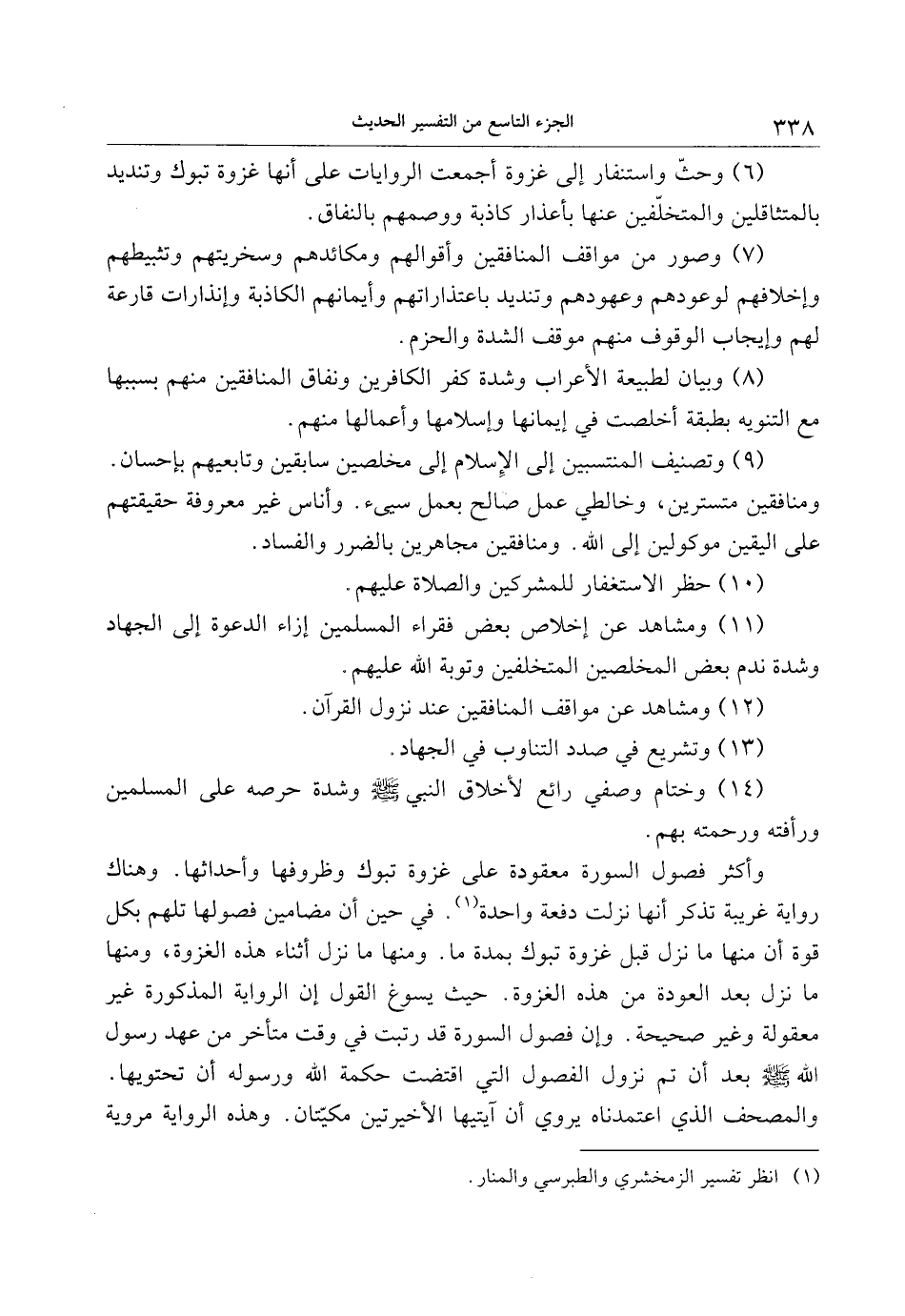 (6) وحثّ واستنفار إلى غزوة أجمعت الروايات على أنها غزوة تبوك وتنديد بالمتثاقلين والمتخلّفين عنها بأعذار كاذبة ووصمهم بالنفاق.