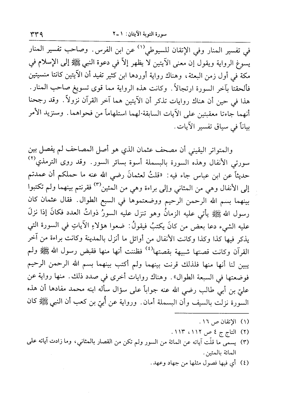 والمتواتر اليقيني أن مصحف عثمان الذي هو أصل المصاحف لم يفصل بين سورتي الأنفال وهذه السورة بالبسملة أسوة بسائر السور. وقد روى الترمذي «2» حديثا عن ابن عباس جاء فيه: «قلت لعثمان رضي الله عنه ما حملكم أن عمدتم إلى الأنفال وهي من المثاني وإلى براءة وهي من المئين «3» فقرنتم بينهما ولم تكتبوا بينهما بسم الله الرحمن الرحيم ووضعتموها في السبع الطوال. فقال عثمان كان رسول الله صلى الله عليه وسلم يأتي عليه الزمان وهو تنزل عليه السور ذوات العدد فكان إذا نزل عليه الشيء دعا بعض من كان يكتب فيقول: ضعوا هؤلاء الآيات في السورة التي يذكر فيها كذا وكذا وكانت الأنفال من أوائل ما أنزل بالمدينة وكانت براءة من آخر القرآن وكانت قصتها شبيهة بقصتها «4» فظننت أنها منها فقبض رسول الله صلى الله عليه وسلم ولم يبين لنا أنها منها فلذلك قرنت بينهما ولم أكتب بينهما بسم الله الرحمن الرحيم فوضعتها في السبعة الطوال» . وهناك روايات أخرى في صدد ذلك. منها رواية عن عليّ بن أبي طالب رضي الله عنه جوابا على سؤال سأله ابنه محمد مفادها أن هذه السورة نزلت بالسيف وأن البسملة أمان. ورواية عن أبيّ بن كعب أن النبي صلى الله عليه وسلم كان