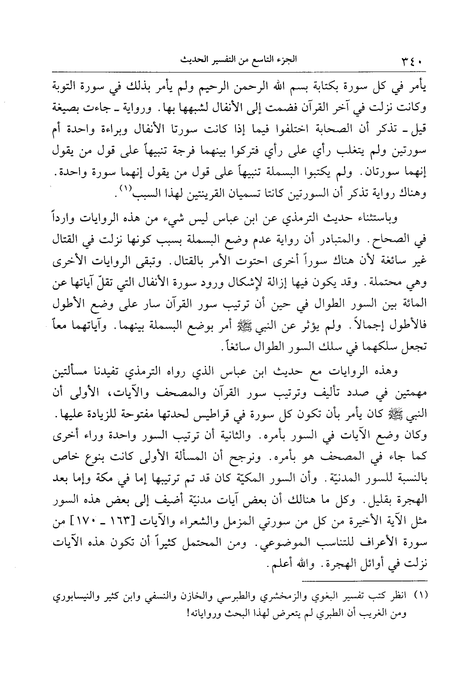 يأمر في كل سورة بكتابة بسم الله الرحمن الرحيم ولم يأمر بذلك في سورة التوبة وكانت نزلت في آخر القرآن فضمت إلى الأنفال لشبهها بها. ورواية- جاءت بصيغة قيل- تذكر أن الصحابة اختلفوا فيما إذا كانت سورتا الأنفال وبراءة واحدة أم سورتين ولم يتغلب رأي على رأي فتركوا بينهما فرجة تنبيها على قول من يقول إنهما سورتان. ولم يكتبوا البسملة تنبيها على قول من يقول إنهما سورة واحدة.